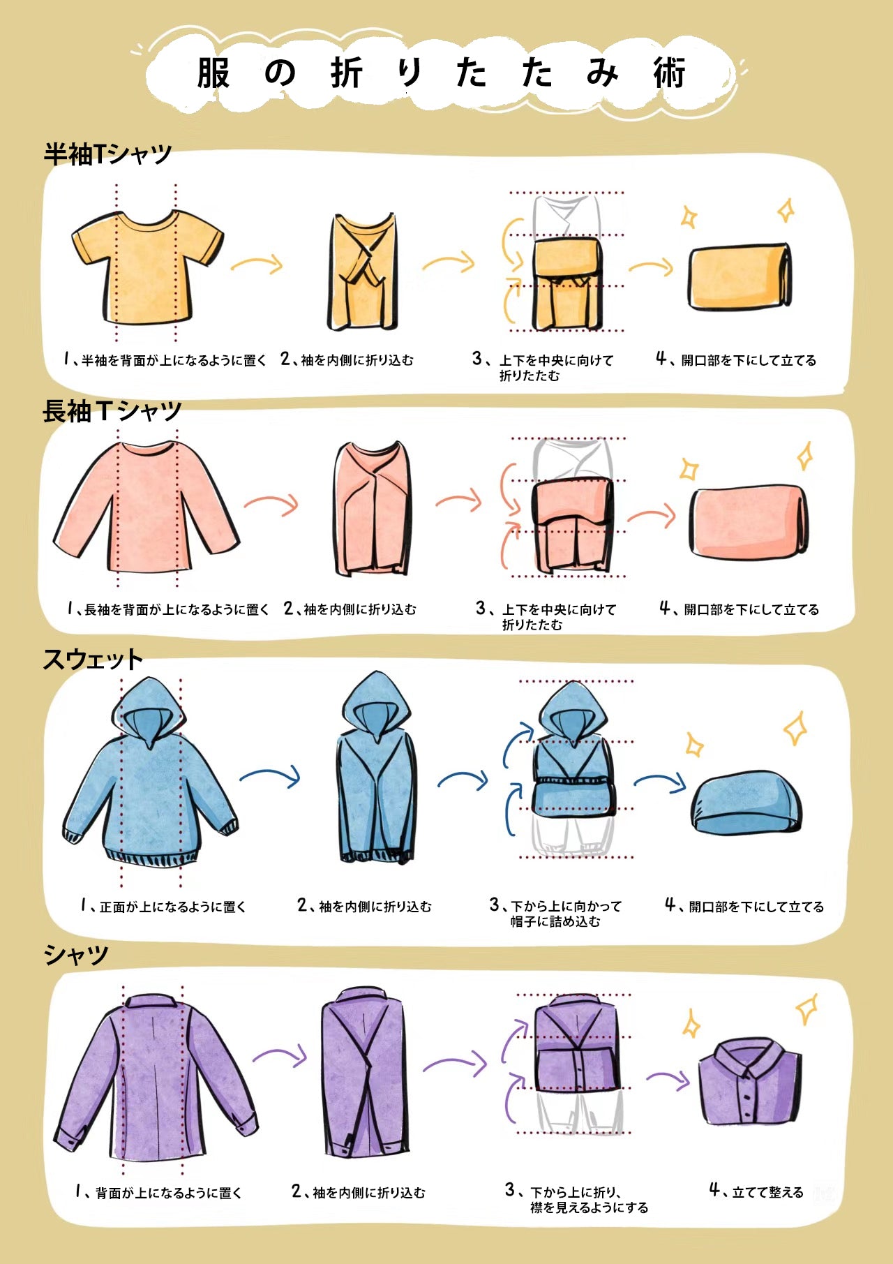 シャツは襟がついているため、折り方によっては型崩れしやすいですが、以下の方法で美しく仕上げることができます。