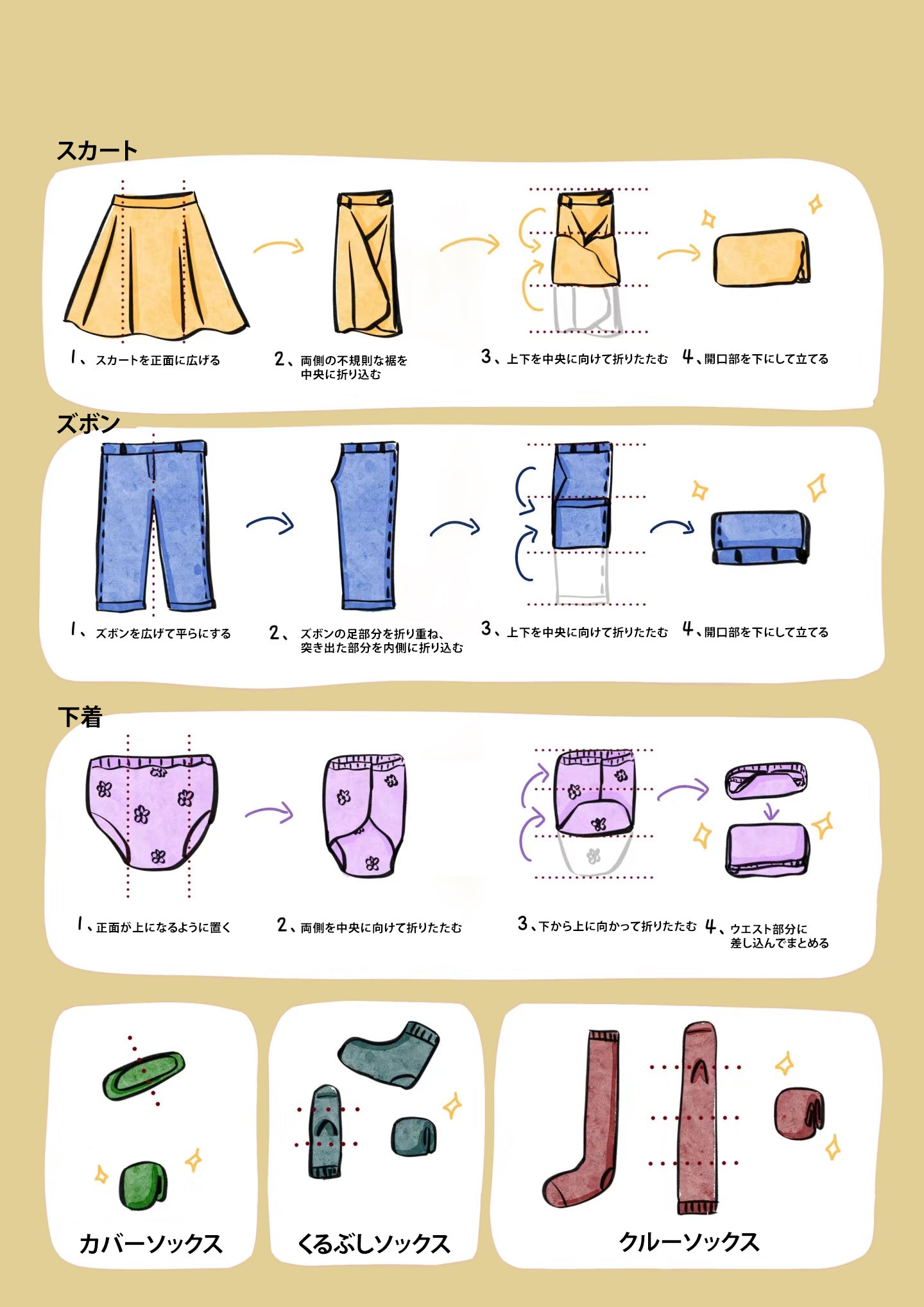 スカートは形状がさまざまですが、基本の畳み方を覚えれば簡単です。