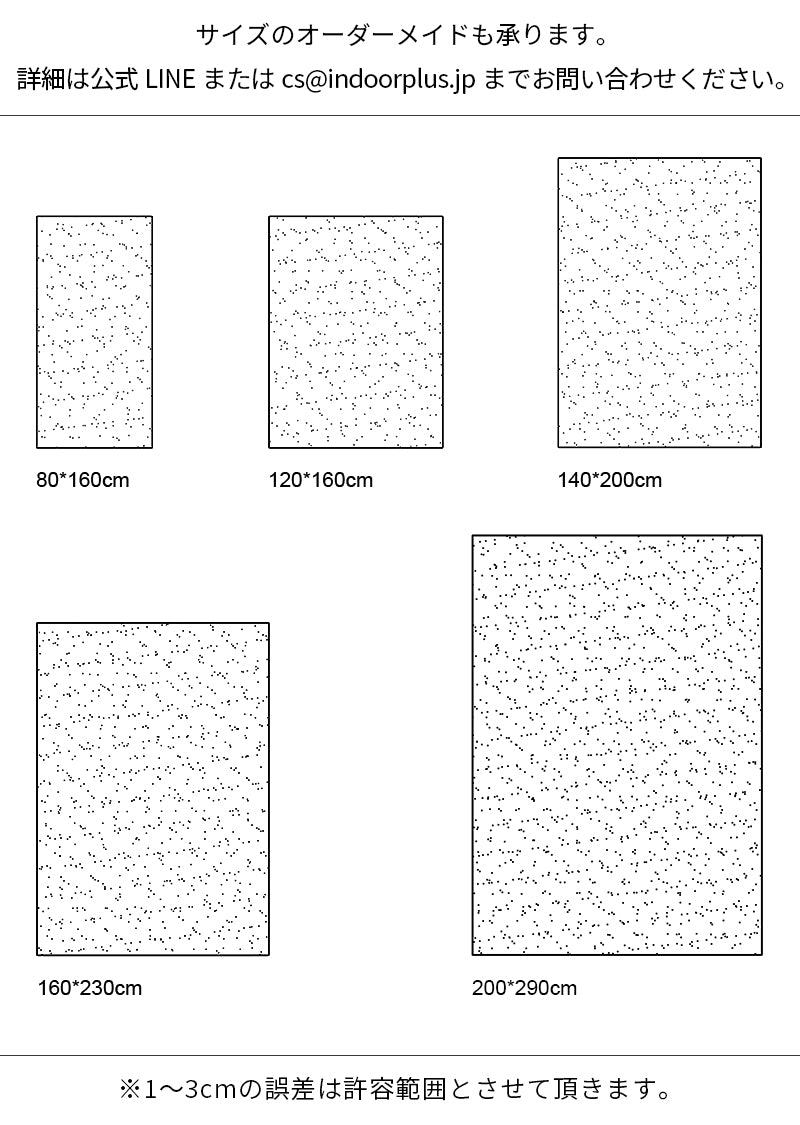 カーペットは織物構造の製品の為、若干サイズのずれが発生しますが、使用に影響が出ない程度に収まります。特に手織りのカーペットにつき、模様を美しくする為に、職人さんより微調整することもありますので、予めご了承ください。