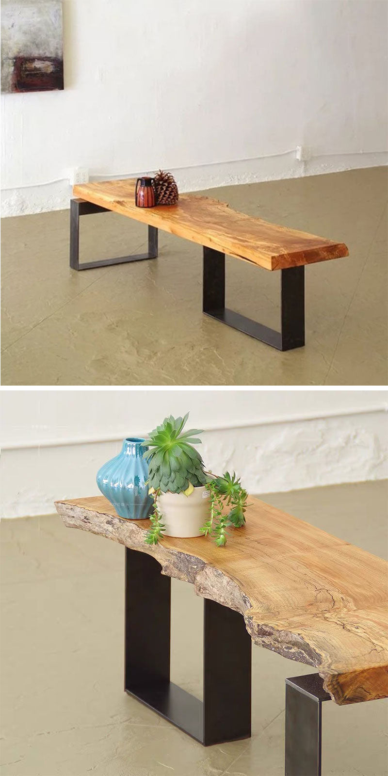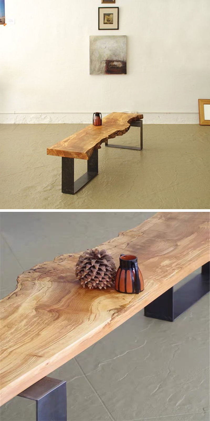 自然な木のラインを活かしたデザインで、直線的な金属の脚と木の表面が対照的に調和しています。