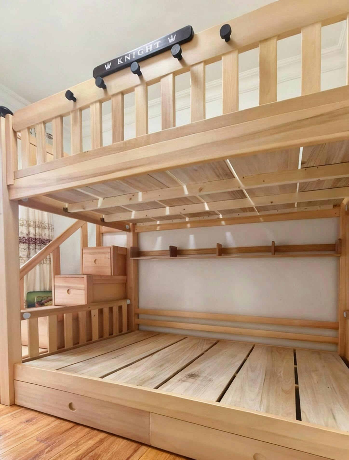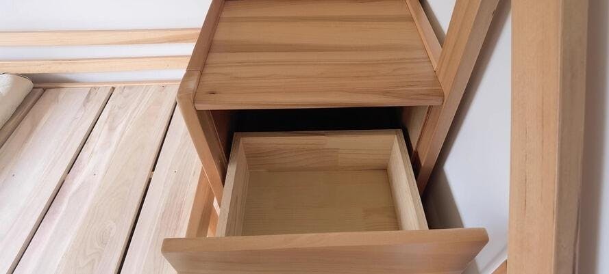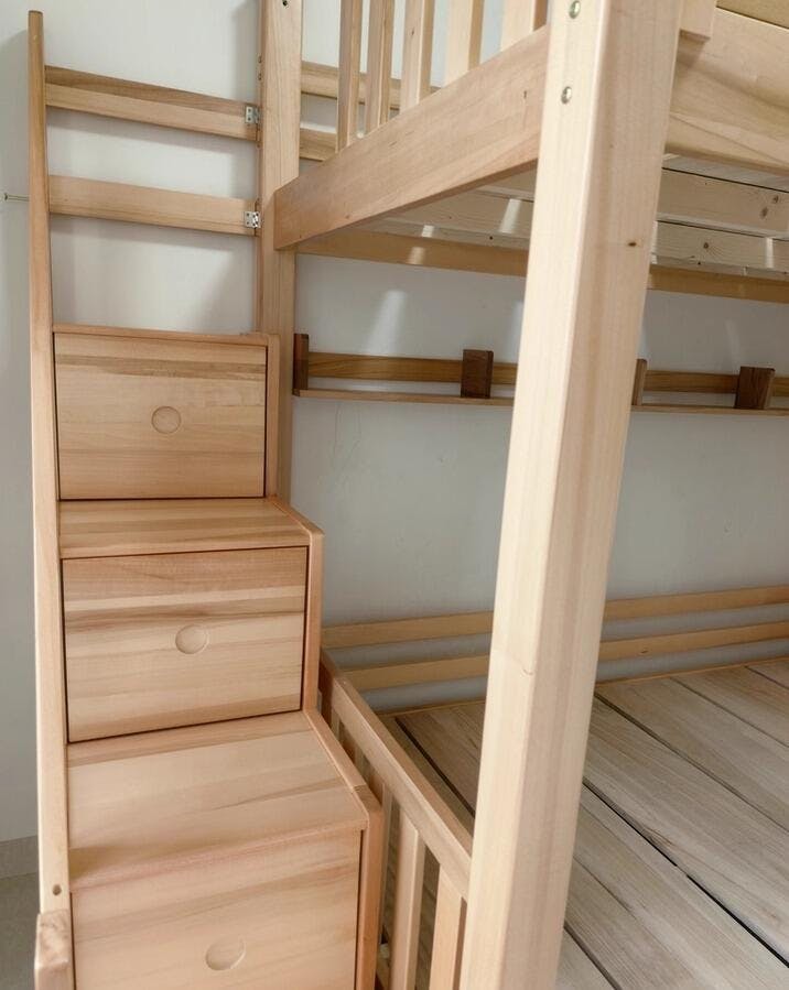 階段は幅広かつ滑り止め加工が施され、ステップごとに引き出し収納も搭載され、衣類やおもちゃをしまいながら、昇降動作もスムーズに行えます。