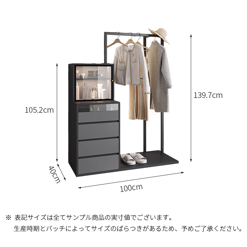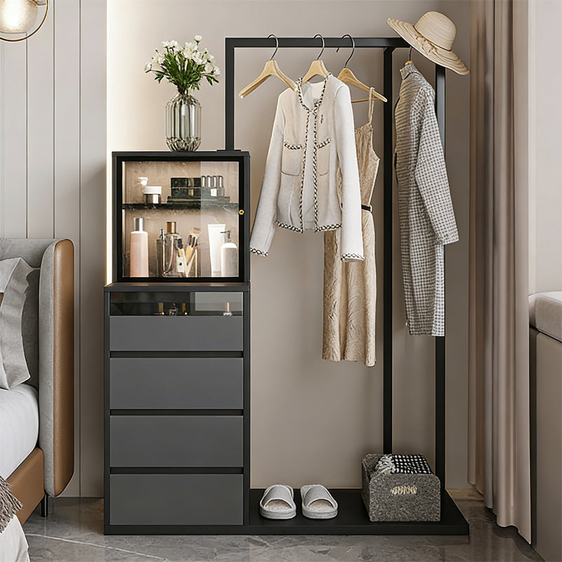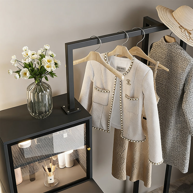 細身のハンガーフレームとガラス扉収納を組み合わせたデザインが印象的。引き締まったシルエットが空間にスタイリッシュな雰囲気をもたらします。