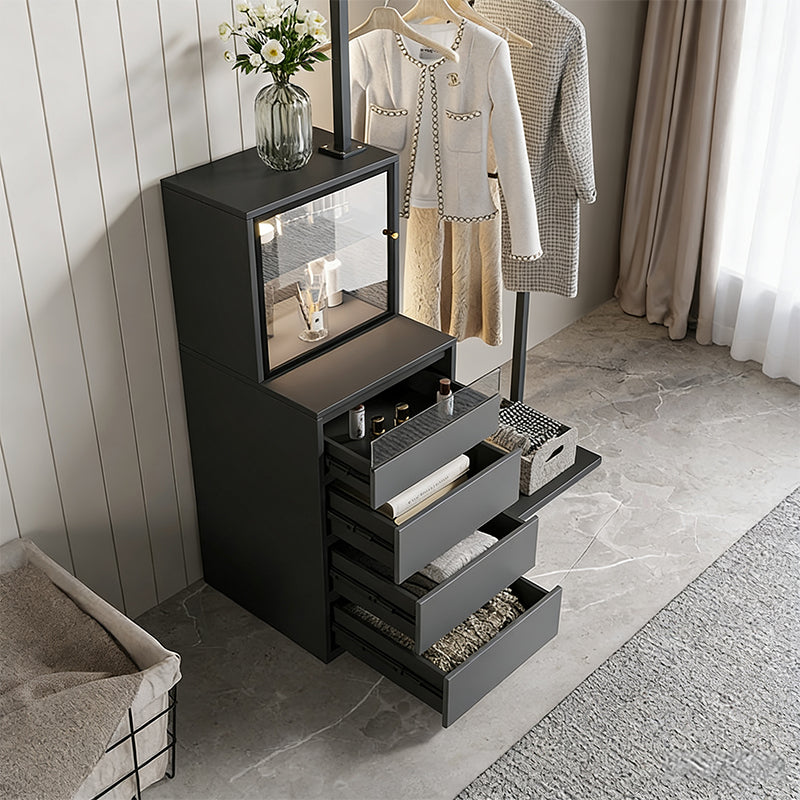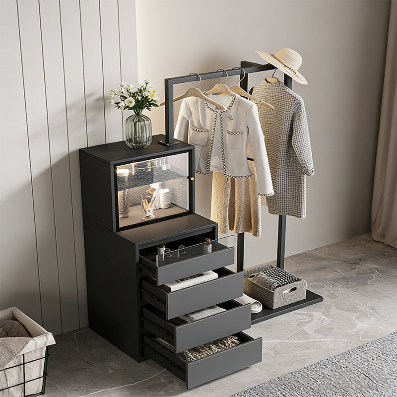 掛ける・見せる収納を同時に叶え、よく使う衣類や小物をすぐ手に取れる配置。引き出しも備え、用途に応じてスマートに分類できます。