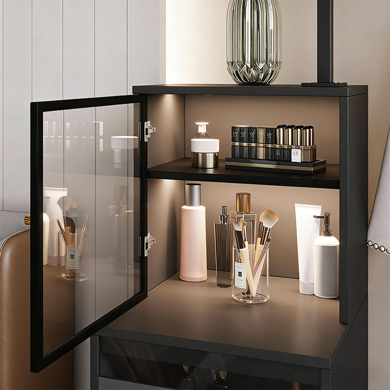 ガラスのディスプレイエリアにはLEDライトを搭載し、お気に入りをきれいに照らしながら視認性も向上。メタルフレームとプリント合板の組み合わせで、日常使いでも安心の安定感があります。