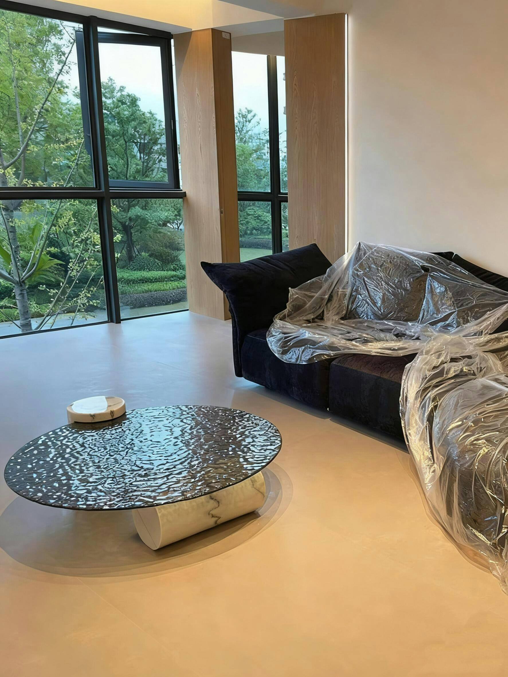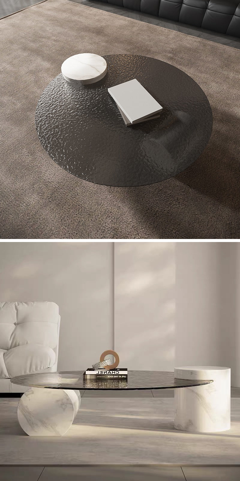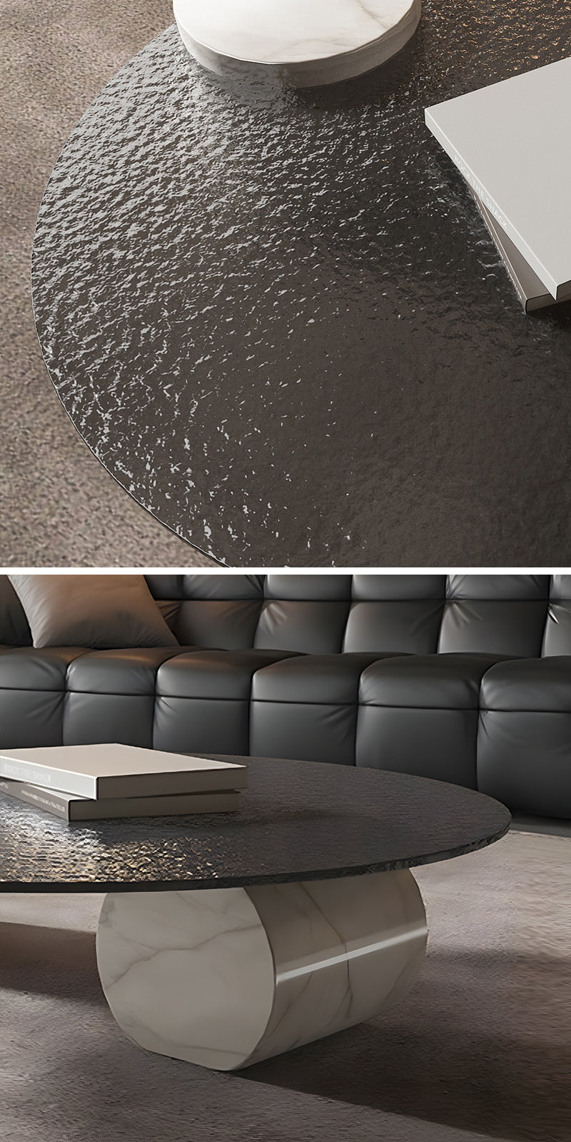 水面に広がる波紋を思わせる水波紋ガラスを天板に採用した、モダンで高級感漂う円形ローテーブルです。光を受けるたびにガラス表面の揺らめきが美しく反射し、リビング空間を上質で洗練された雰囲気に演出します。