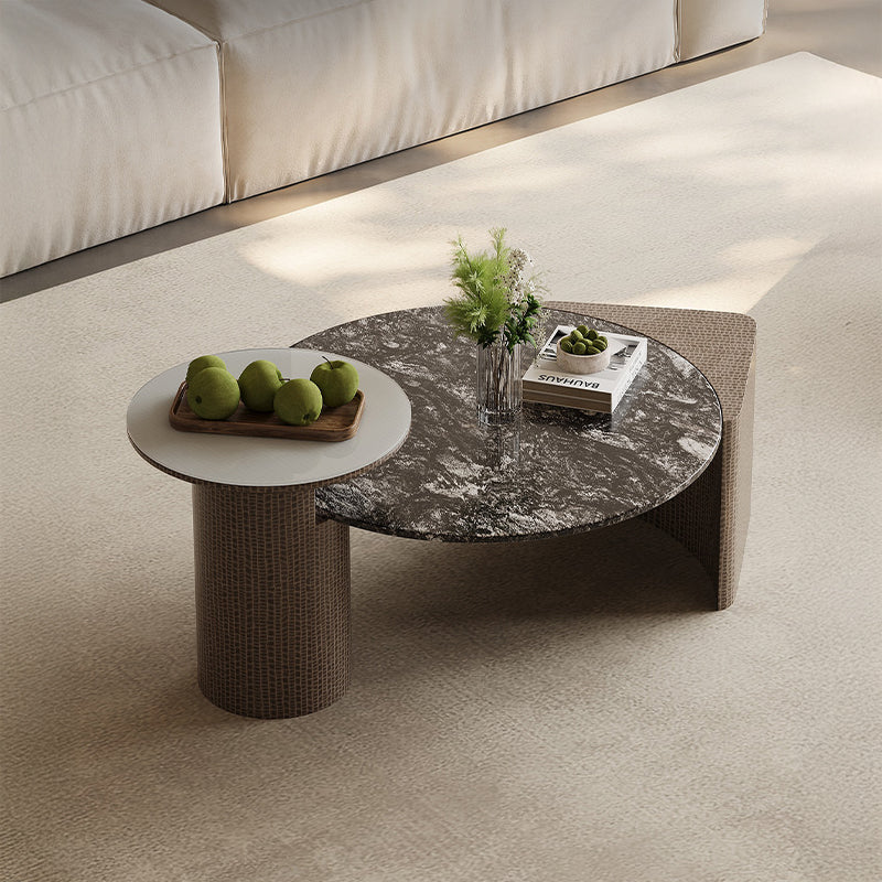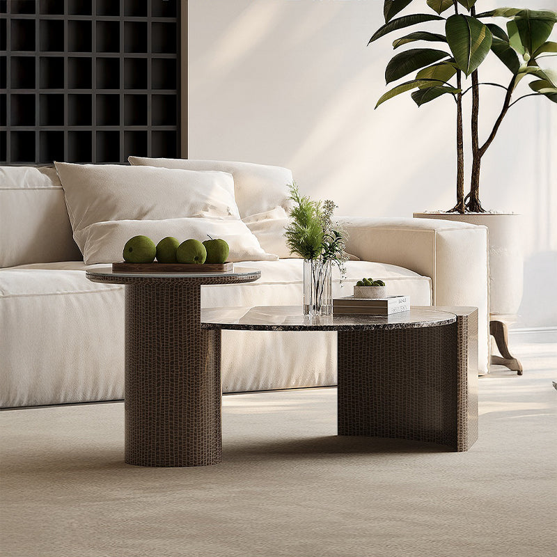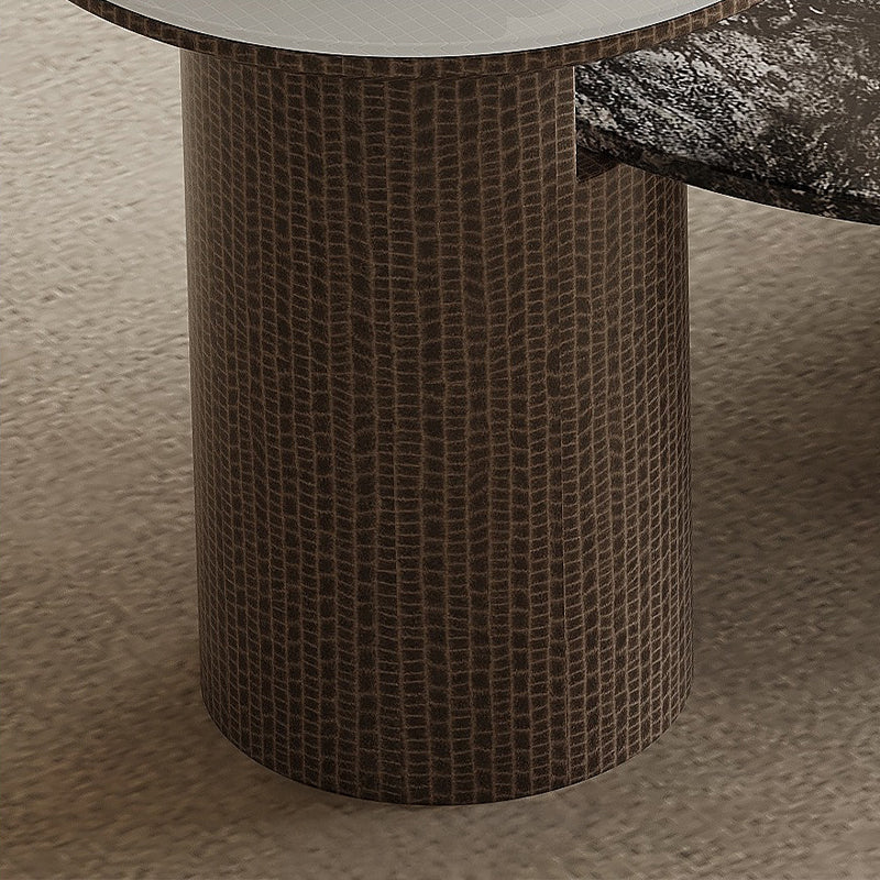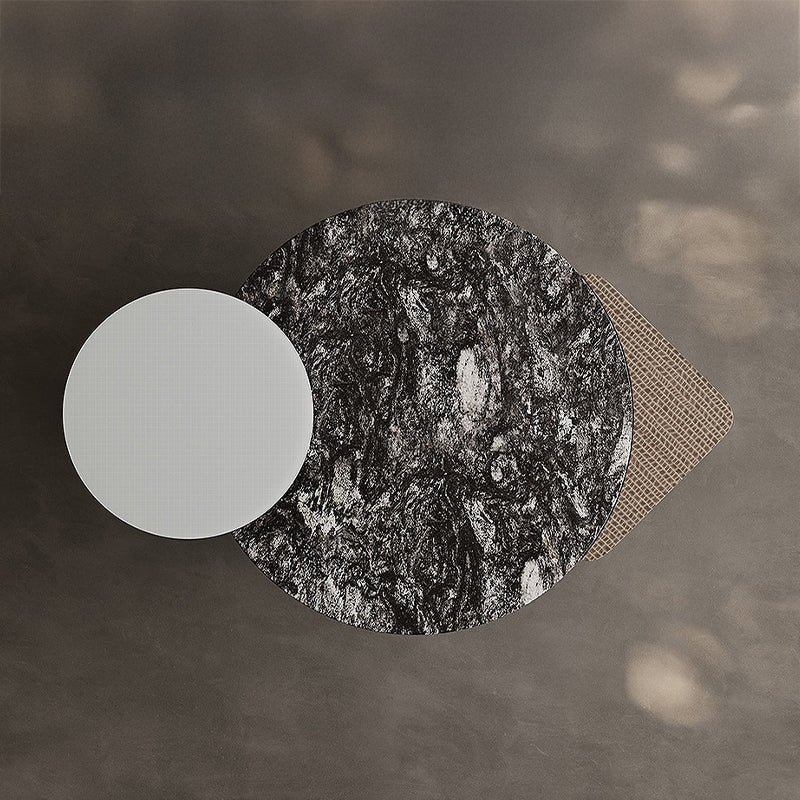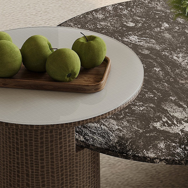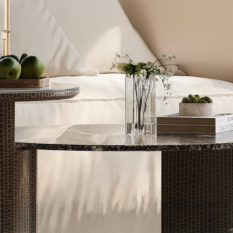 天然大理石と強化ガラスを組み合わせた天板が、光を奥行きのある陰影として映し出し、空間全体に静かな高級感を演出します。