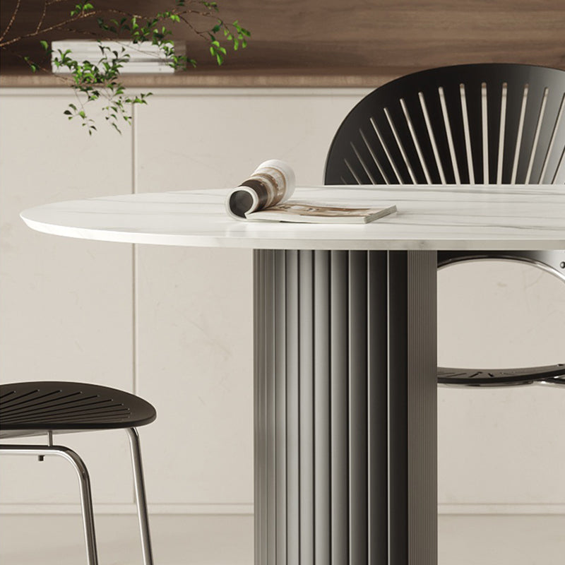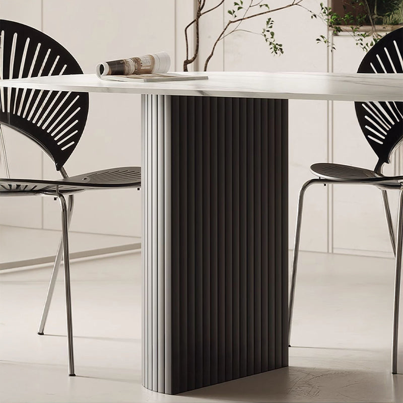 縦ラインを刻むプリント合板脚が建築的な佇まいを生み、テーブル全体をどっしりと支えます。