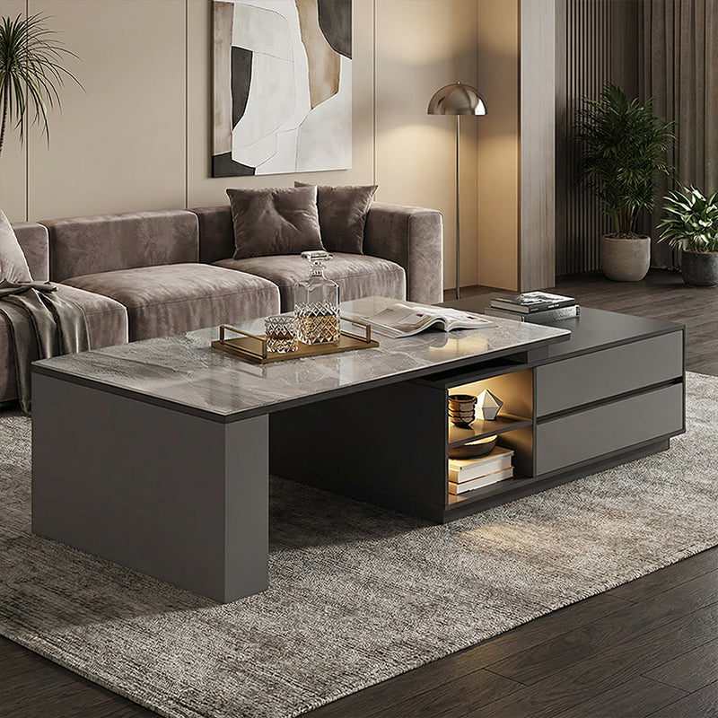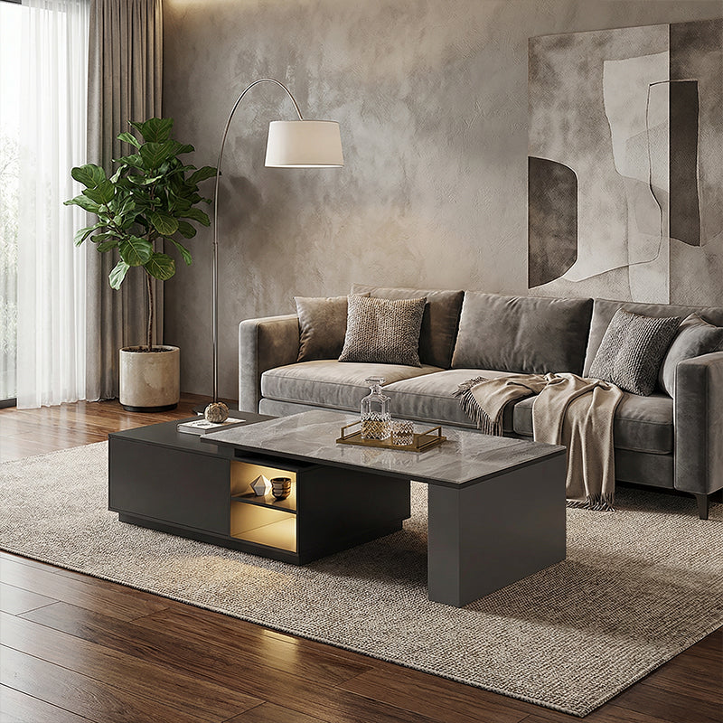 モダンな直線美と重厚感のある天板が調和し、空間に落ち着いた洗練をもたらすローテーブル。石調の質感とガラス面の透明感が、リビングに上質なアクセントを添えます。