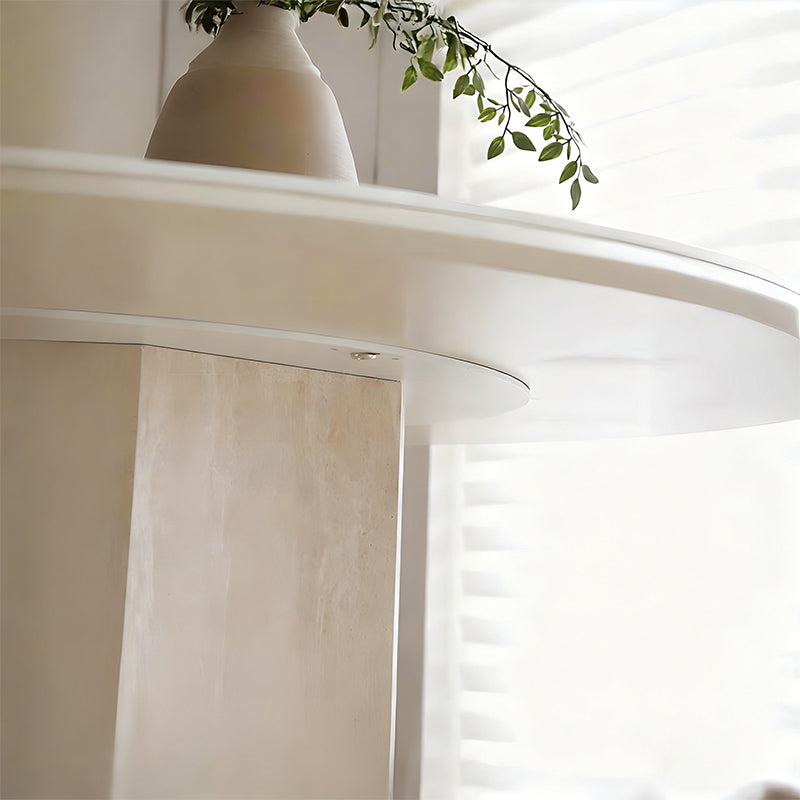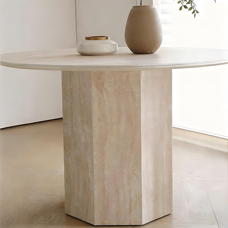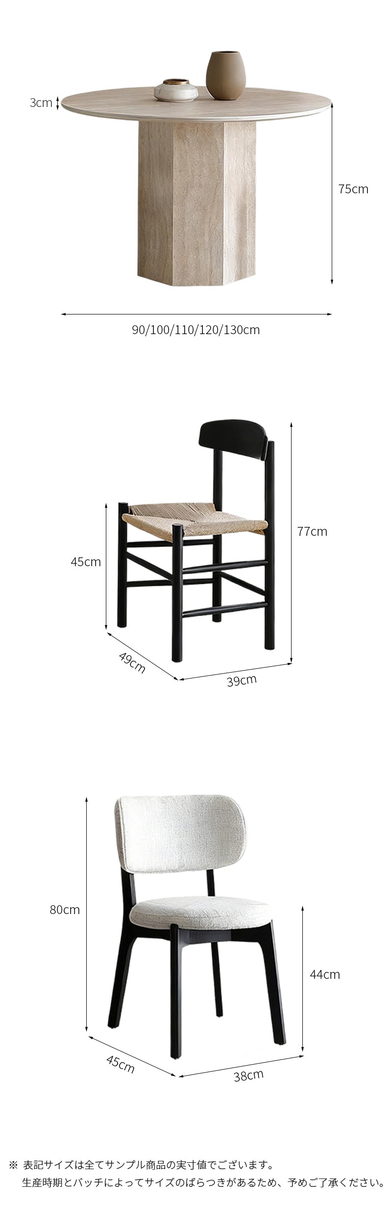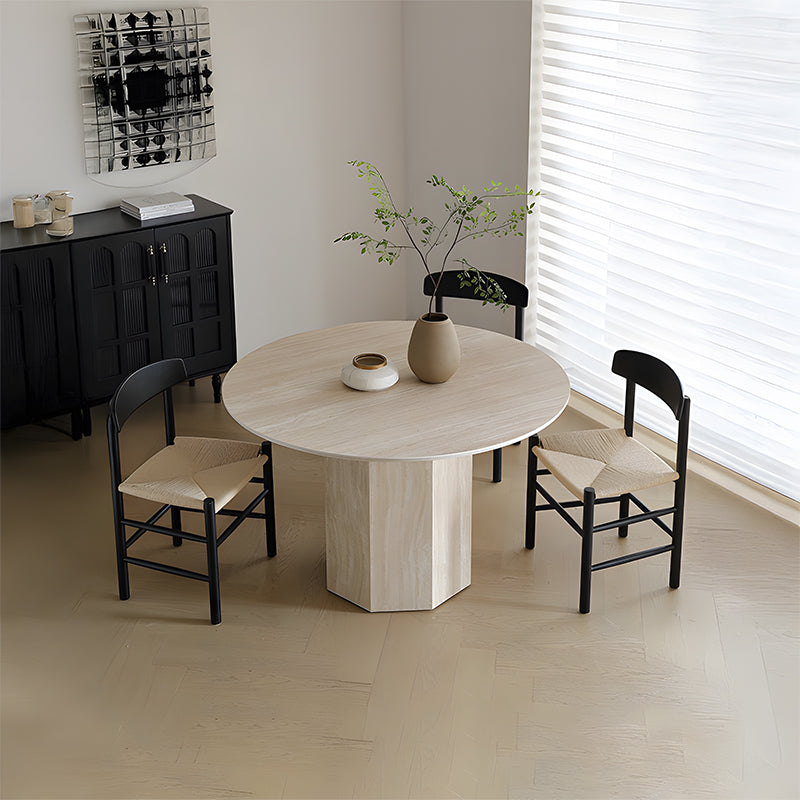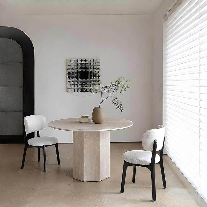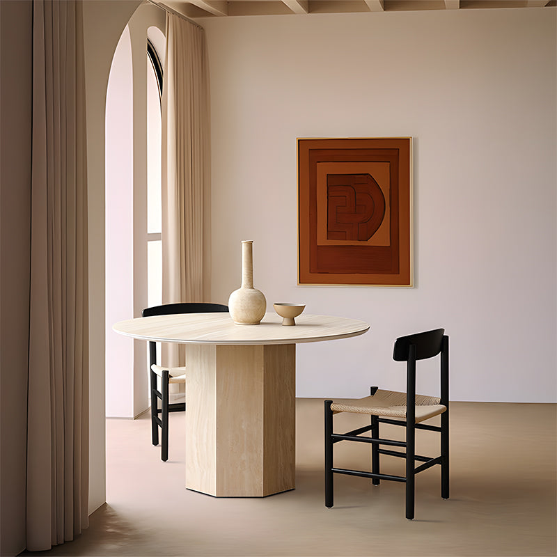 柔らかなトラバーチン柄が、空間にナチュラルで上品な佇まいをもたらすラウンドダイニングテーブルです。