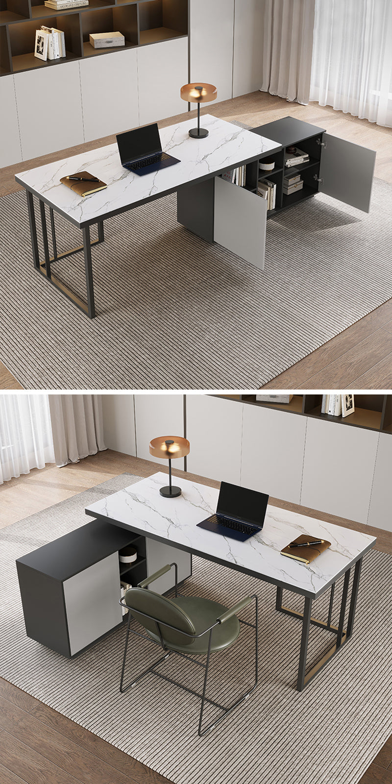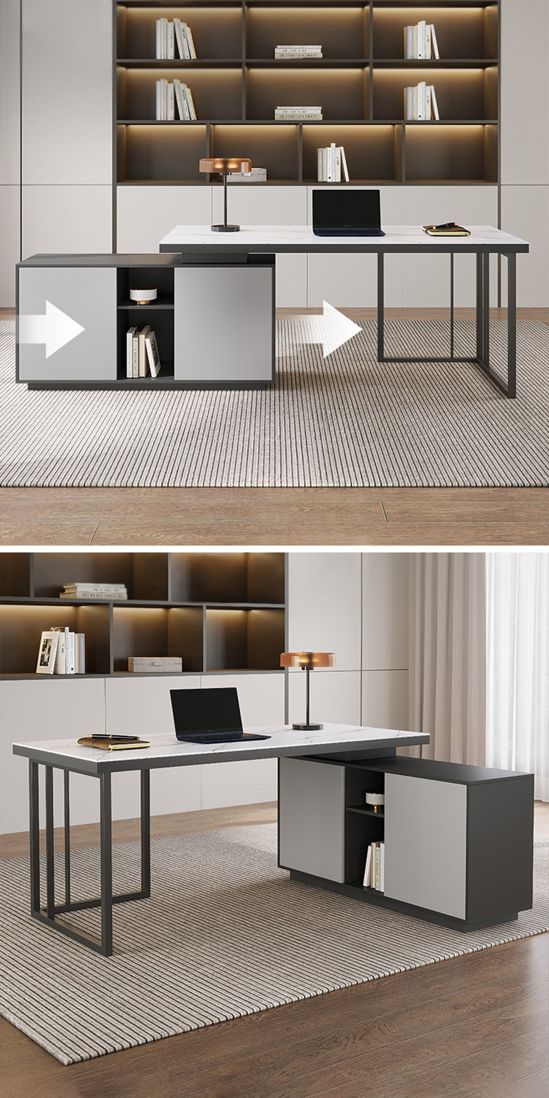 これにより、ユーザーは収納スペースの配置を自由に調整することができ、部屋のレイアウトに合わせてデスクを配置することが可能です。