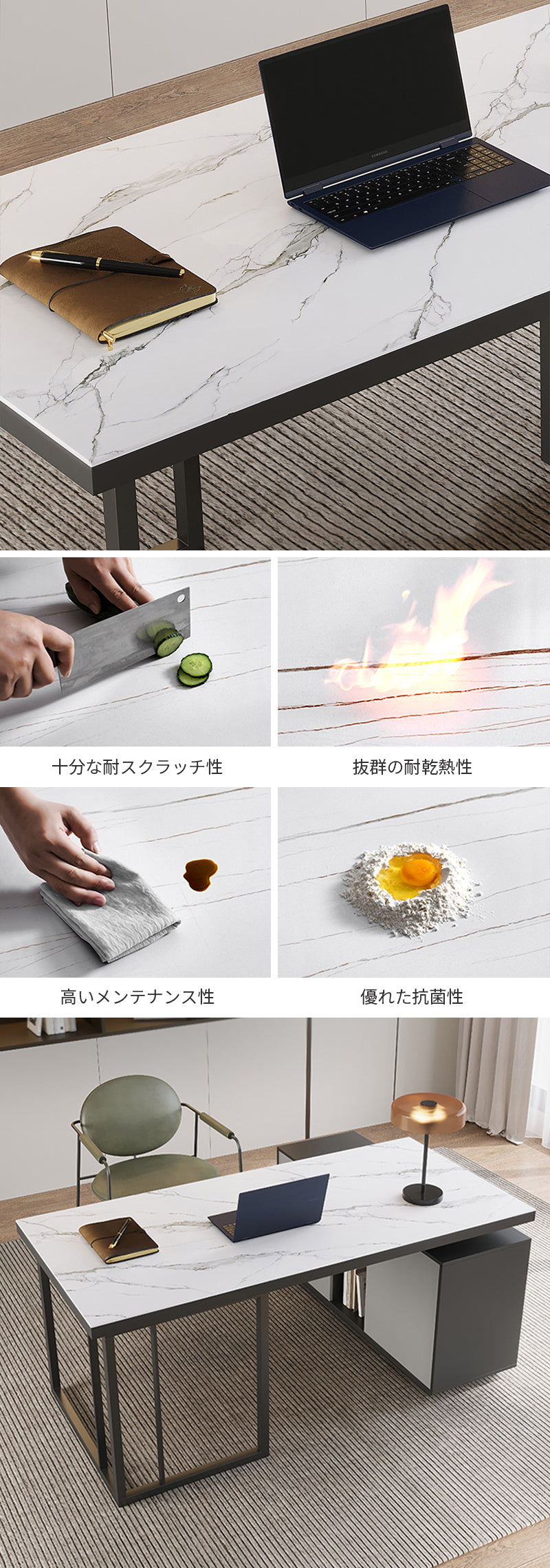 この素材は、耐久性に優れ、傷つきにくいため、長期間使用しても美しい状態を保ちます。さらに、シントレードストーンは熱や水にも強いため、安心して日常の作業に使用できます。