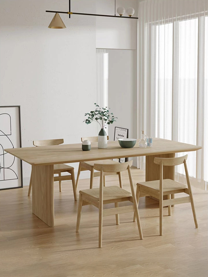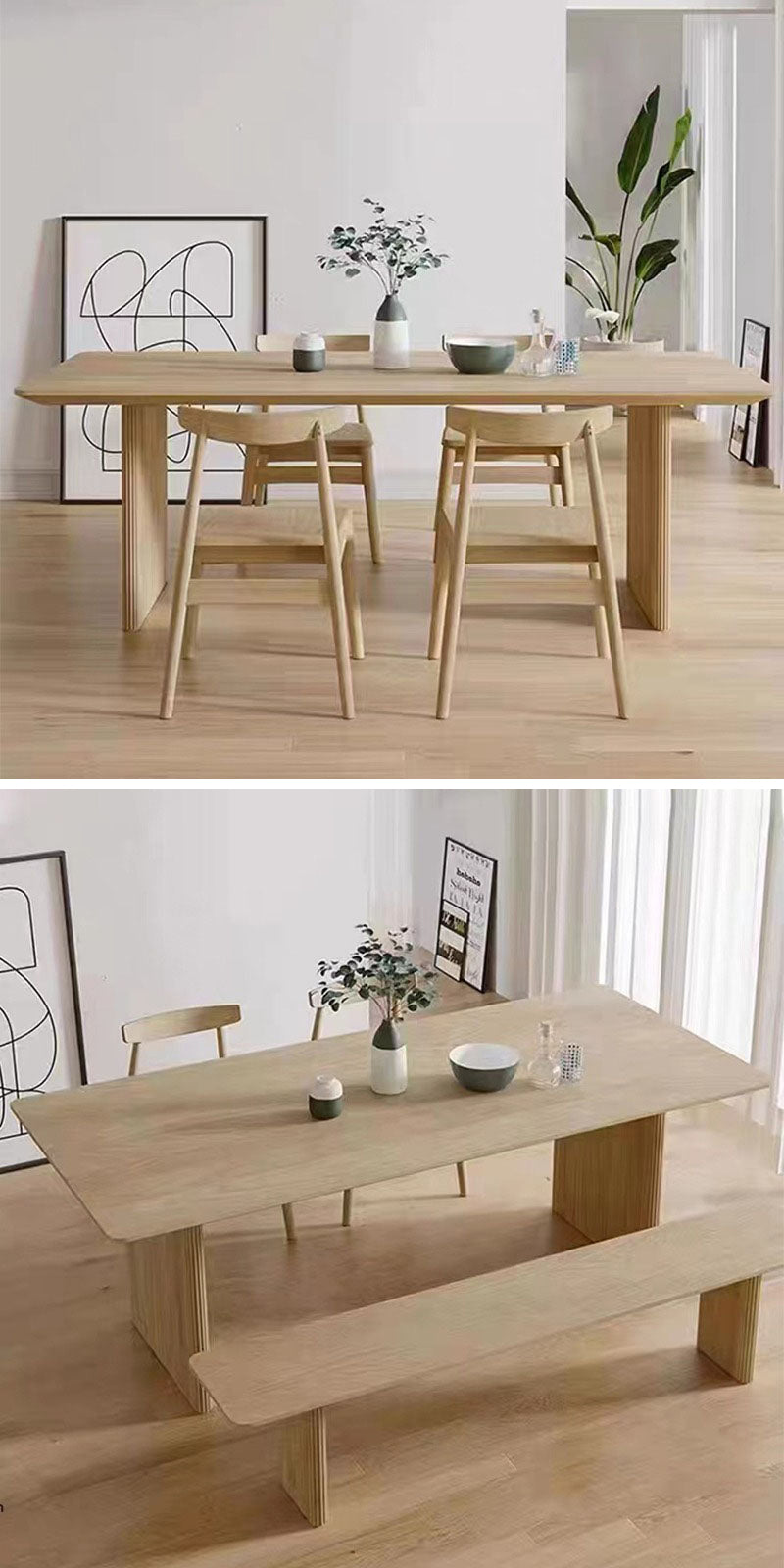 テーブルのシンプルなラインと形状は、どんなインテリアスタイルにもマッチし、モダンなダイニングルームにぴったりです。ベンチとチェアを組み合わせたデザインは、家族や友人との食事をより楽しく、快適にします。