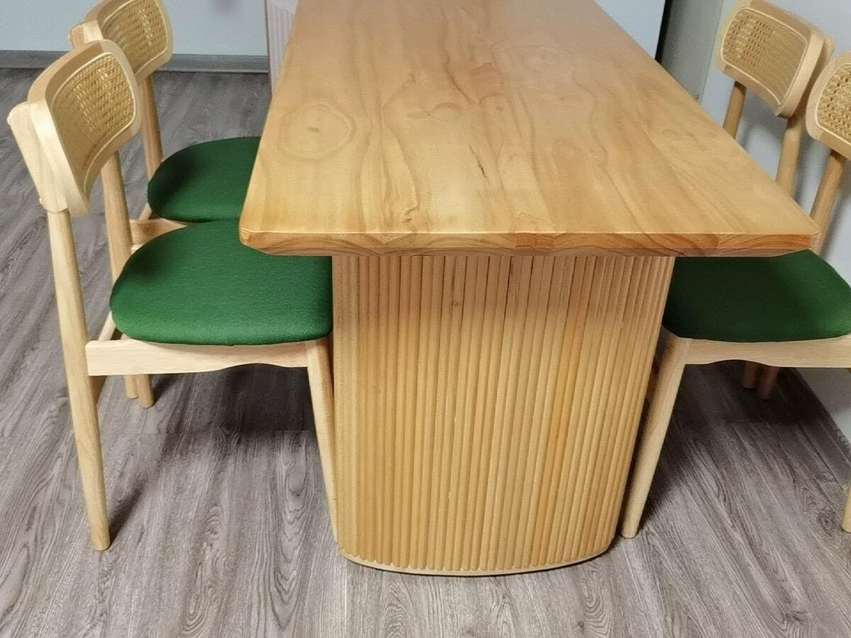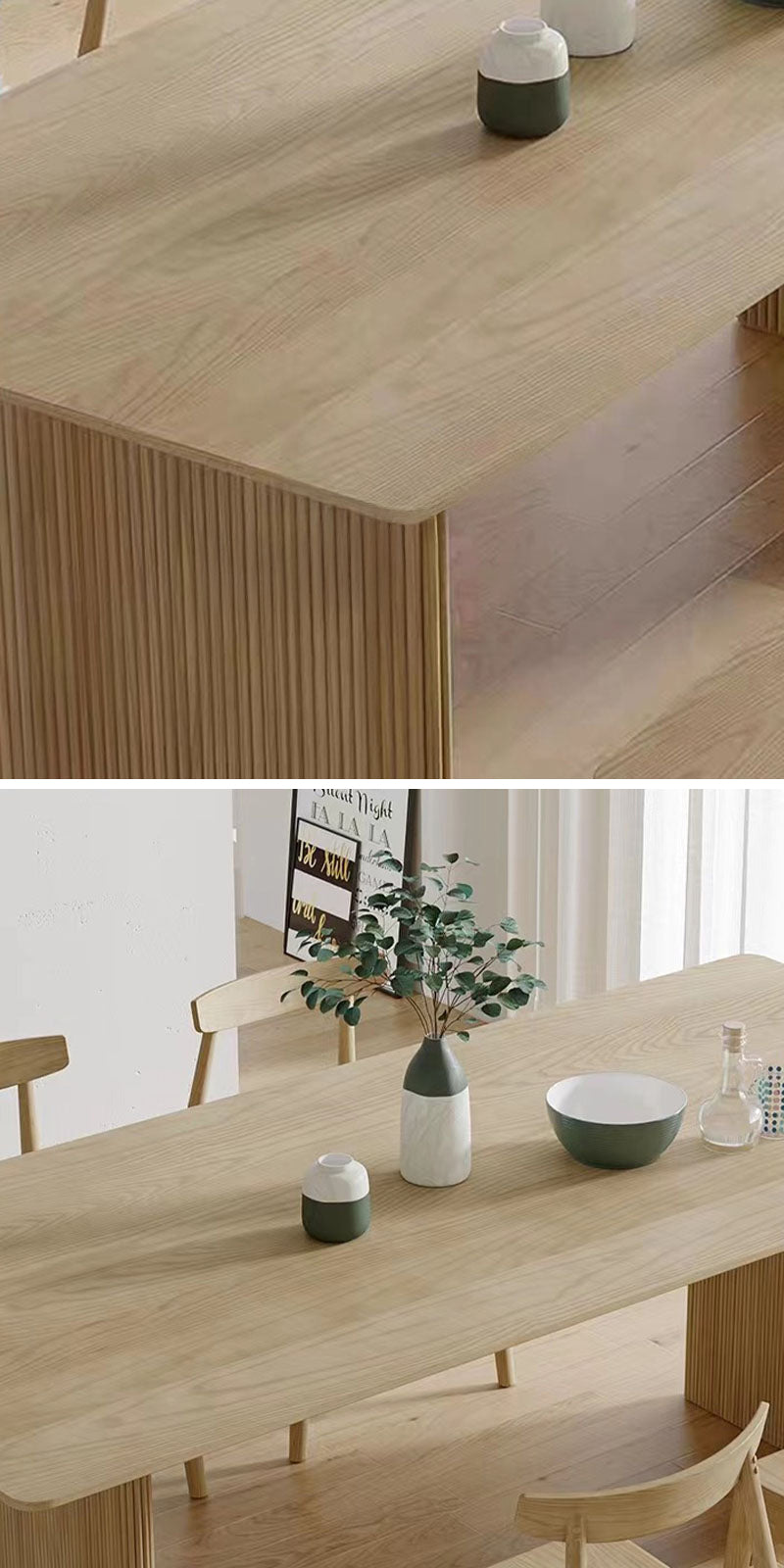 全体的なデザインは、視覚的にも心地よく、リラックスした空間を提供します。松木を使用しており、耐久性と美しさを兼ね備えています。松木は耐摩耗性と耐高温性に優れ、長く使用してもその美しさを保ちます。