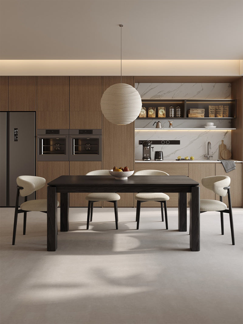直線的なフォルムとシンプルなデザインが、空間を広く見せ、使い勝手の良さを追求しています。洗練されたデザインは、モダンなインテリアに最適で、食事の時間を特別なものにしてくれます。