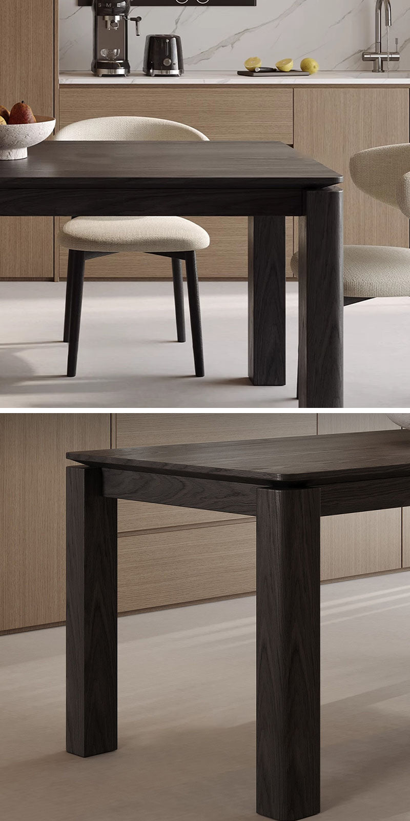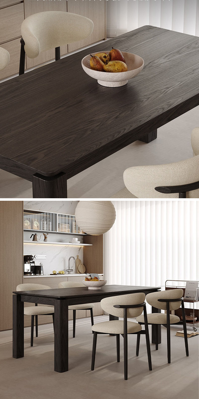 ダークウッドの天板は、木目の美しさが引き立ち、どんなダイニングルームにもマッチします。アイボリーの椅子とのコントラストが、美しい調和を生み出しています。