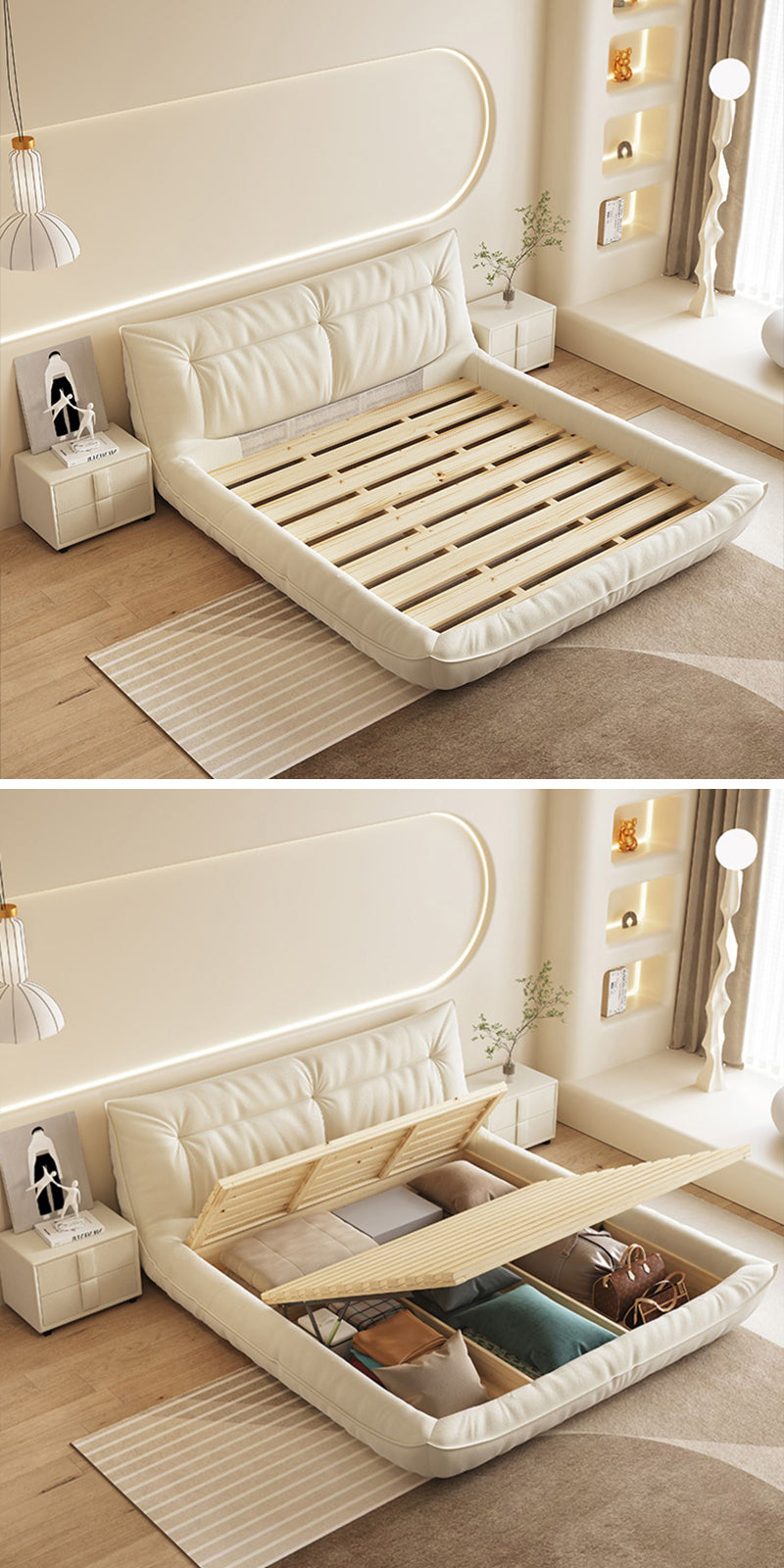 収納付きベッドには大容量の収納スペースがあり、衣服や小物をすっきりと収納できるため、整然とした空間作りをサポートします。