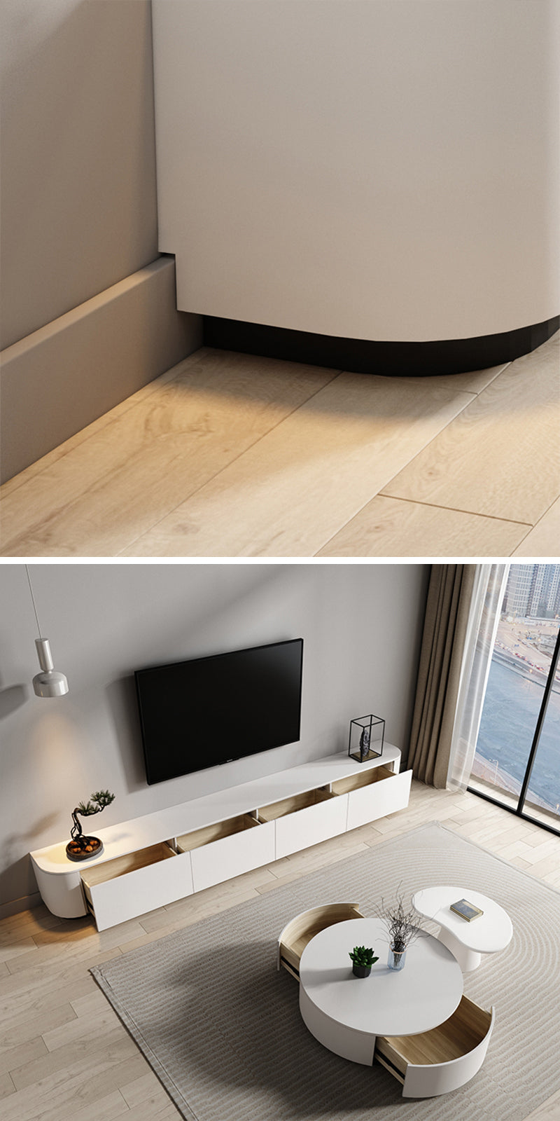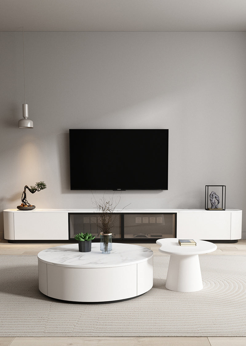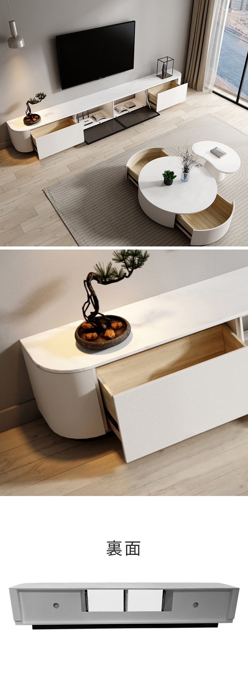 このテレビ台は、部屋に開放感をもたらし、広々とした印象を与えつつ、暖かく居心地の良いリラックス空間を演出します。
