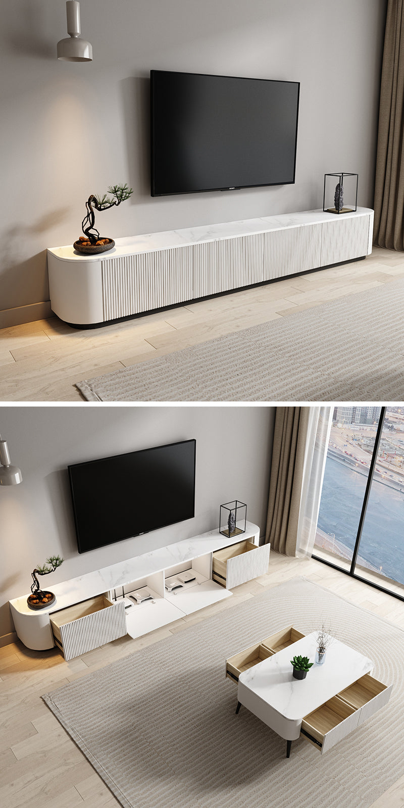 完全に密閉されたストレージはスペース利用率を高め、物を整理整頓できならが、配線口付きのため、すっきりとした見た目を保ちます。