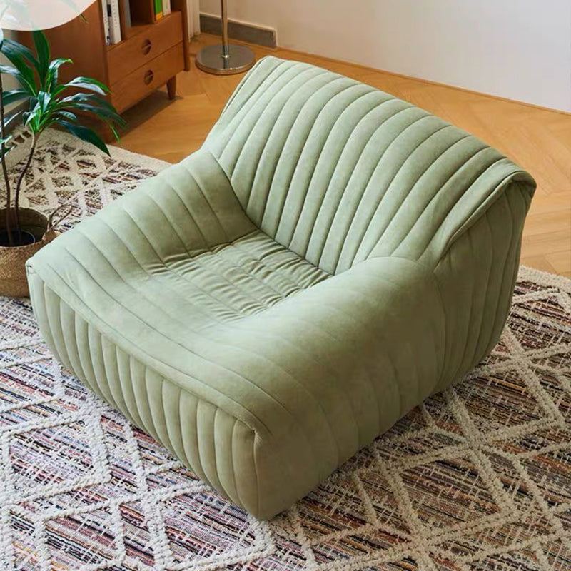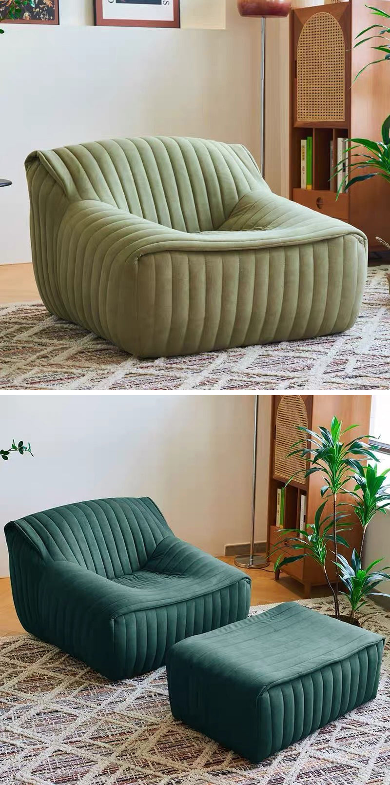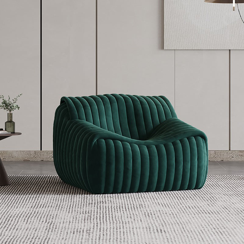 深みのあるダークグリーン素材で覆われたこのソファは、滑らかで繊細な触感を提供します。縦に走るリブ状のディテールが施され、独特の視覚的魅力を放ちます。