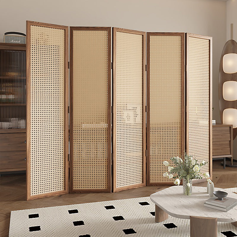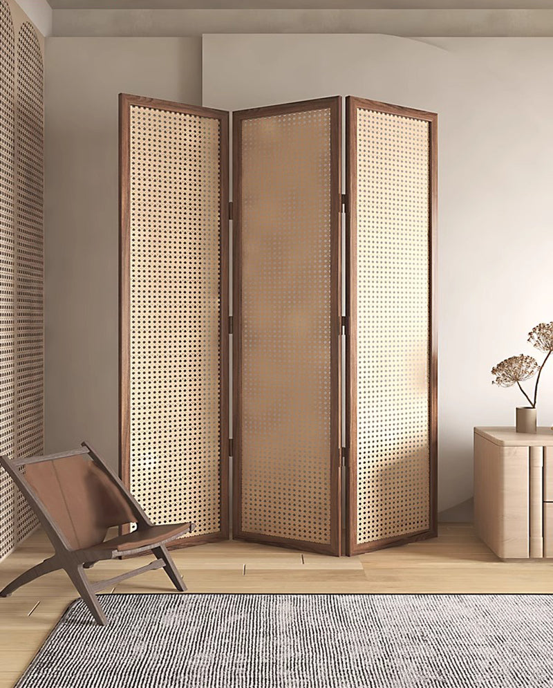 ウォールナットのフレームとラタン、綿麻のパネルが絶妙な調和を生み出し、どんなインテリアにもマッチします。