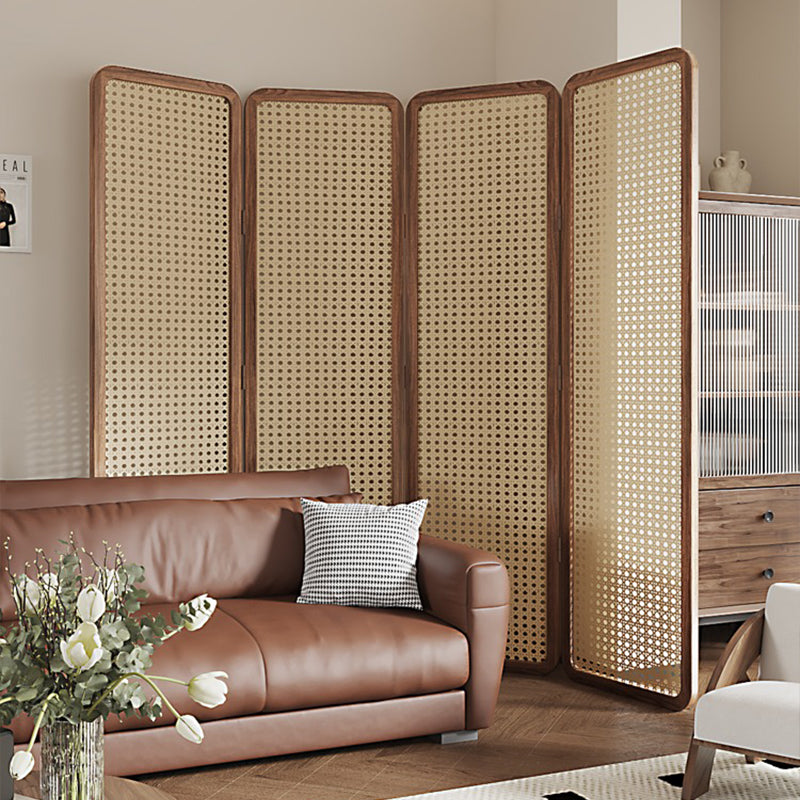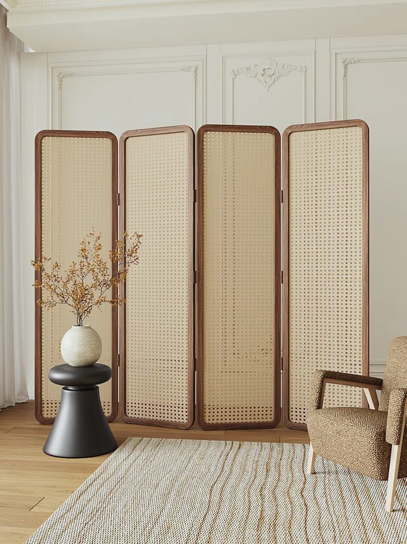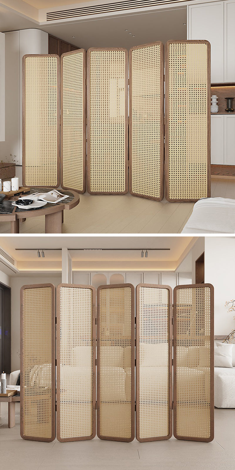 木目調のフレームとラタンの組み合わせが、自然な風合いを演出し、どんなインテリアにも調和するパーテーションです。