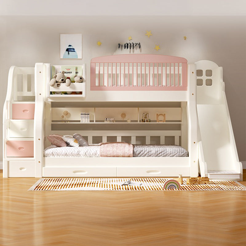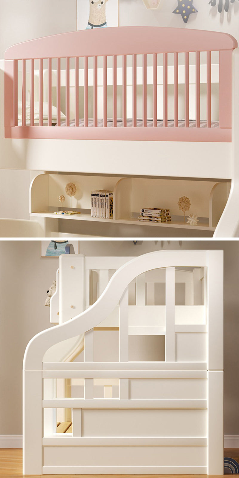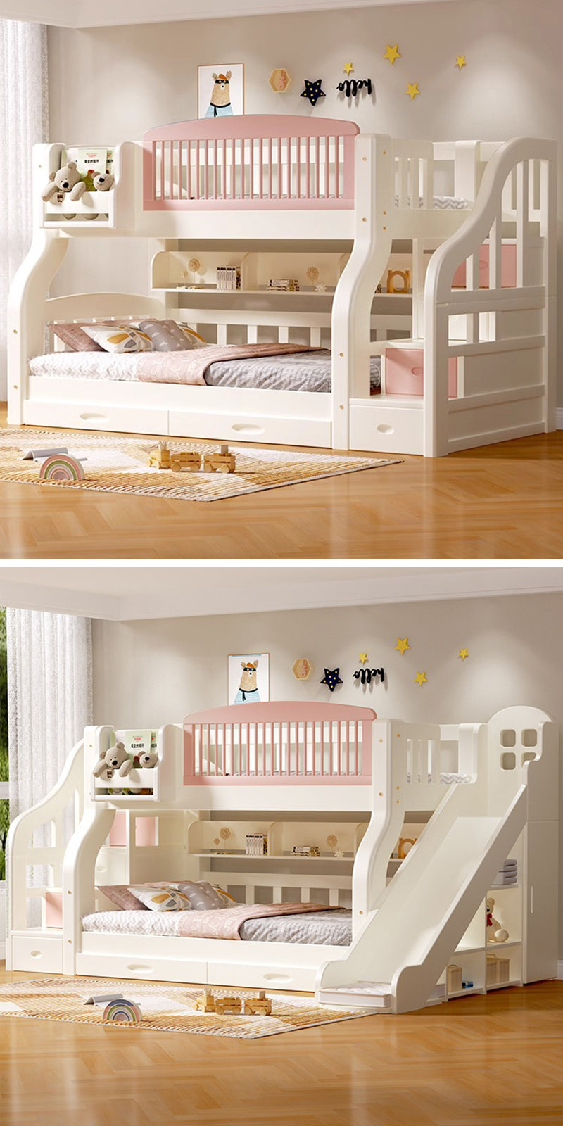 お姫様のようなエレガントなデザインが特徴な二段ベッドです。ホワイトとピンクの組み合わせが、お部屋を明るく華やかに演出します。滑り台と階段タンスの2種類のオプションがあり、お子様の成長やお部屋のスペースに合わせて選ぶことができます。