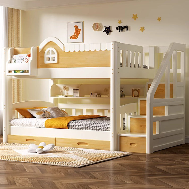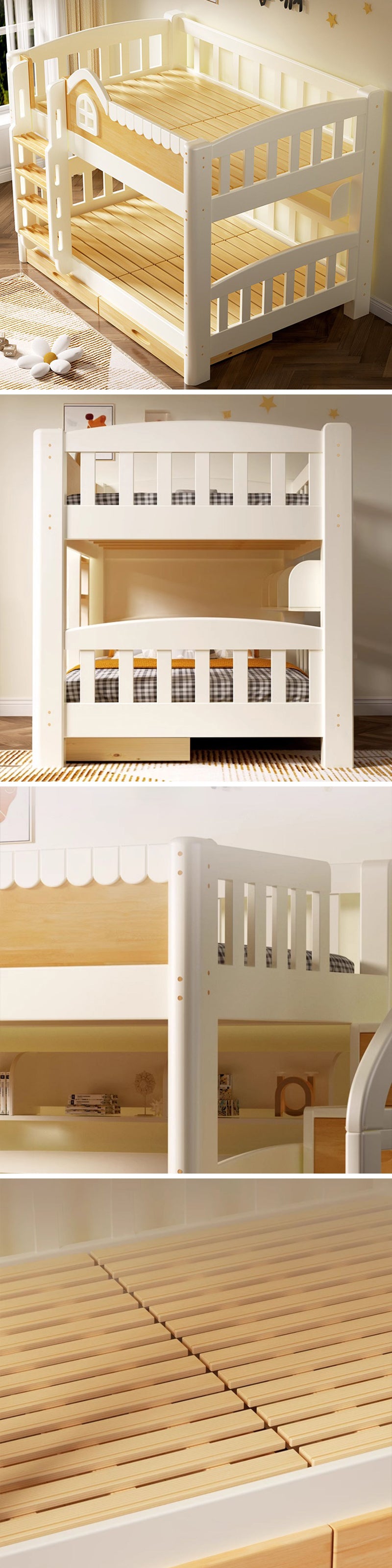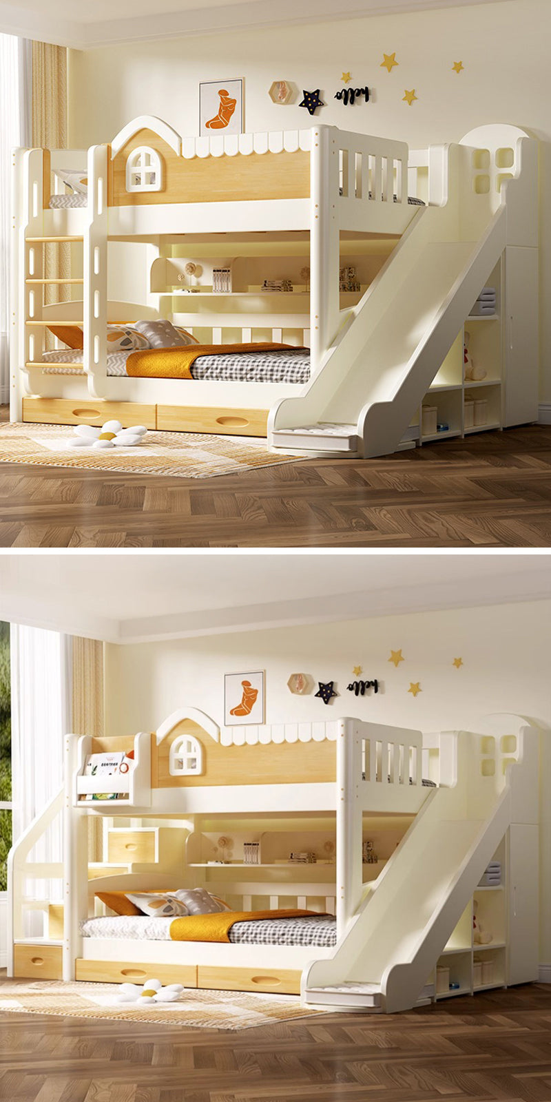 この二段ベッドは、特に子供部屋やファミリールームに最適です。上り階段と滑り台が付いているため、お子様の遊び場としても活躍します。