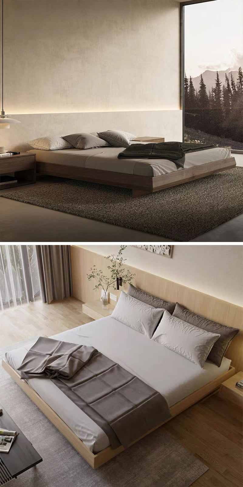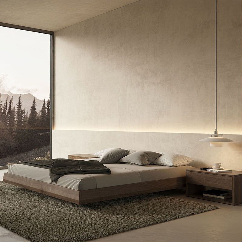 このベッドは、無駄を省いたミニマルな美しさを追求し、部屋全体に落ち着きと高級感をもたらします。