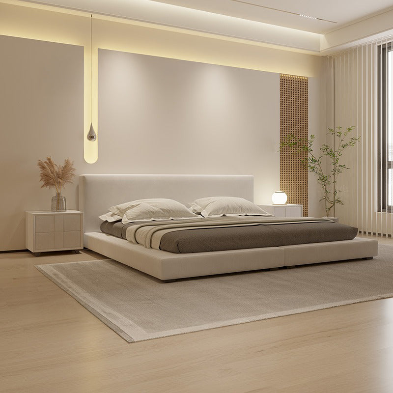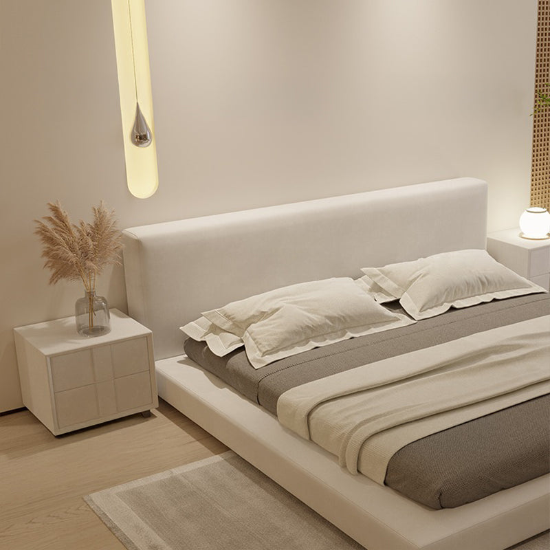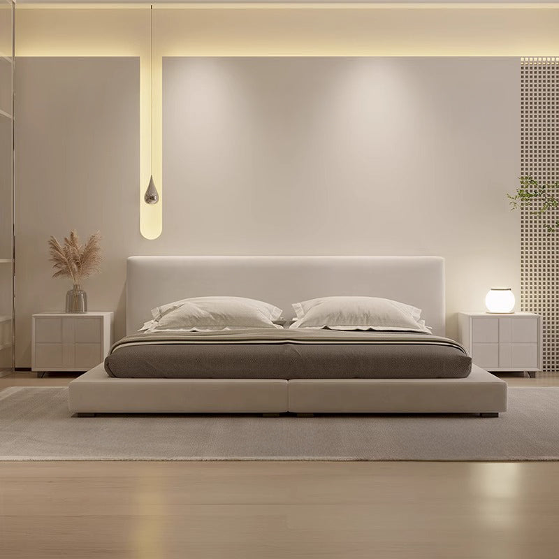 このベッドは、シンプルでありながら洗練されたデザインが魅力です。ホワイトの柔らかな色合いが、寝室全体に明るさと清潔感をもたらします。低いプロファイルと直線的なラインが、視覚的に部屋を広く見せる効果があります。