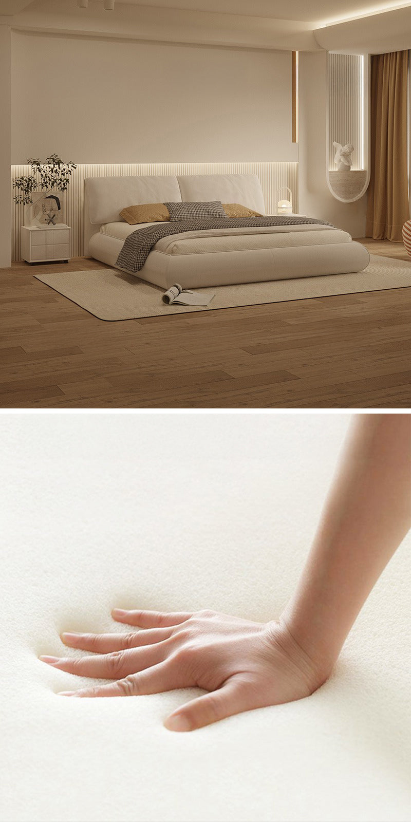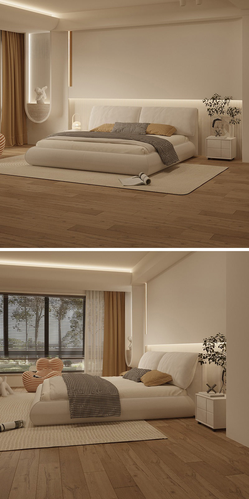 低いプロファイルと曲線的なラインが、視覚的に部屋を広く見せます。ヘッドボードは控えめなディテールが施されており、シンプルながらも洗練された印象を与えます。