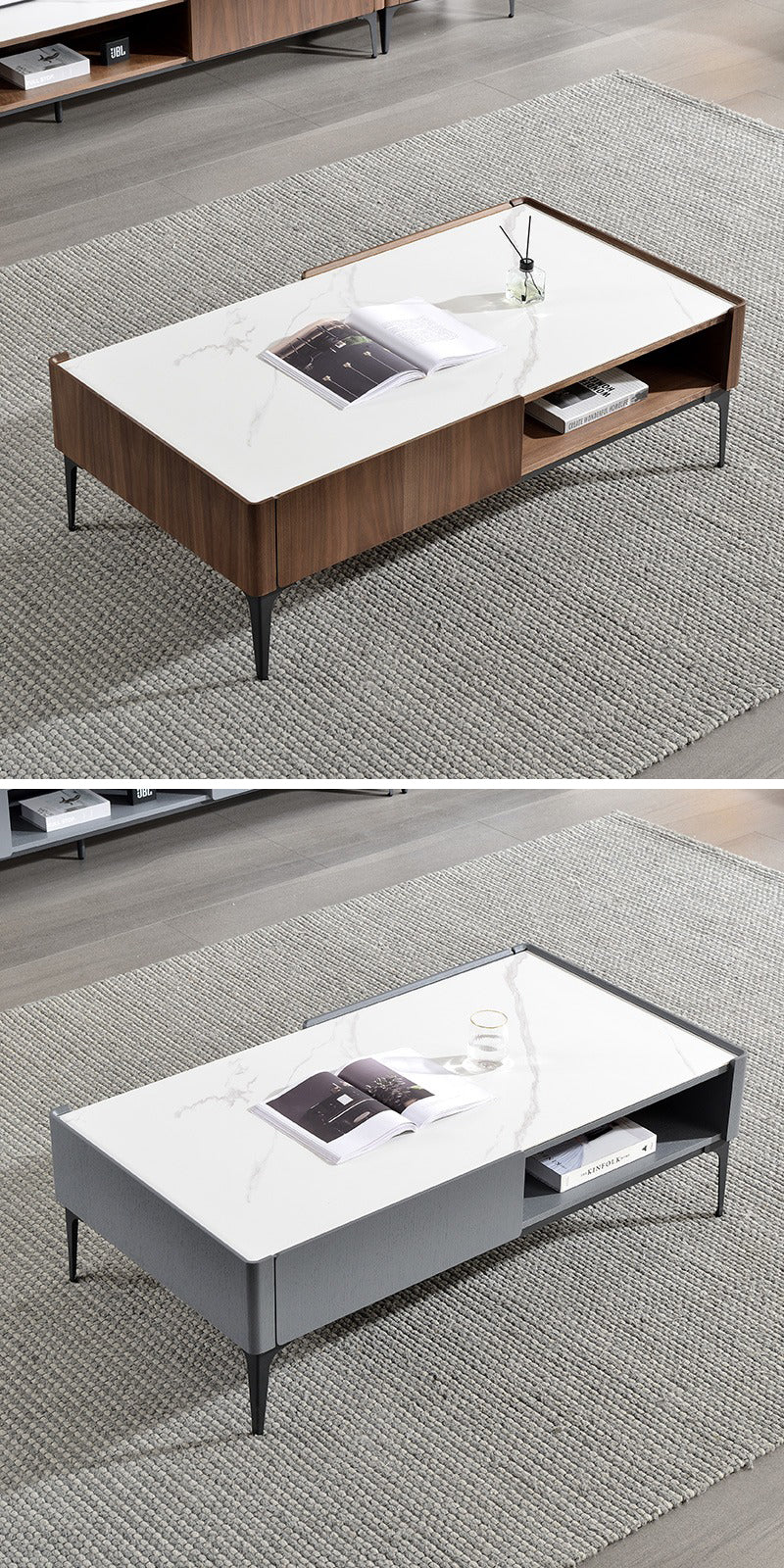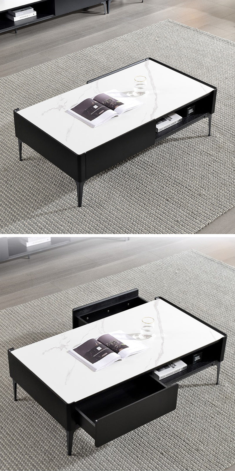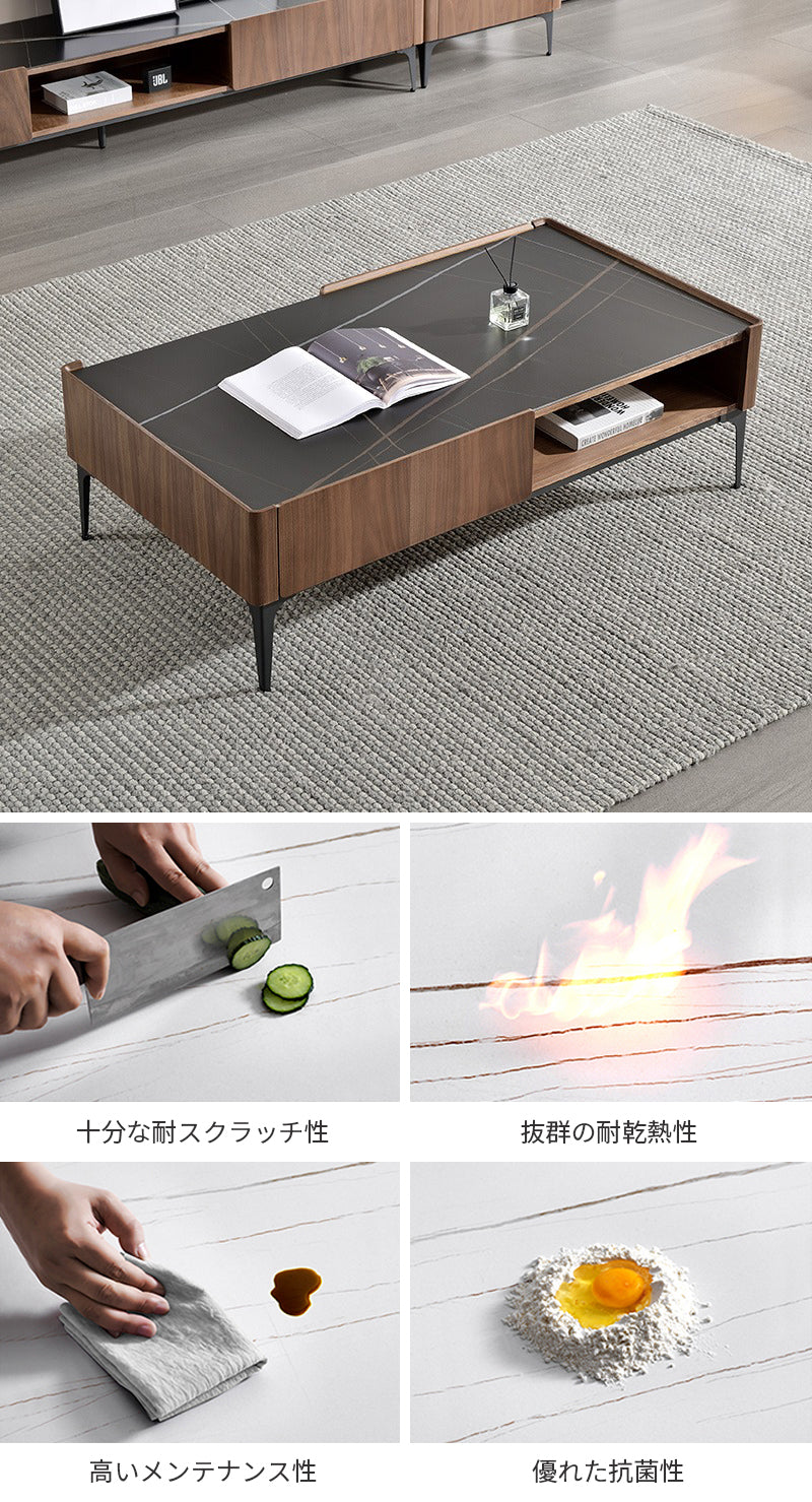 シンプルでありながら洗練されたデザインが特徴的なローテーブルです。天板には高級シントレードストーンが使われており、その美しい光沢と自然な模様が部屋全体に高級感を与えます。