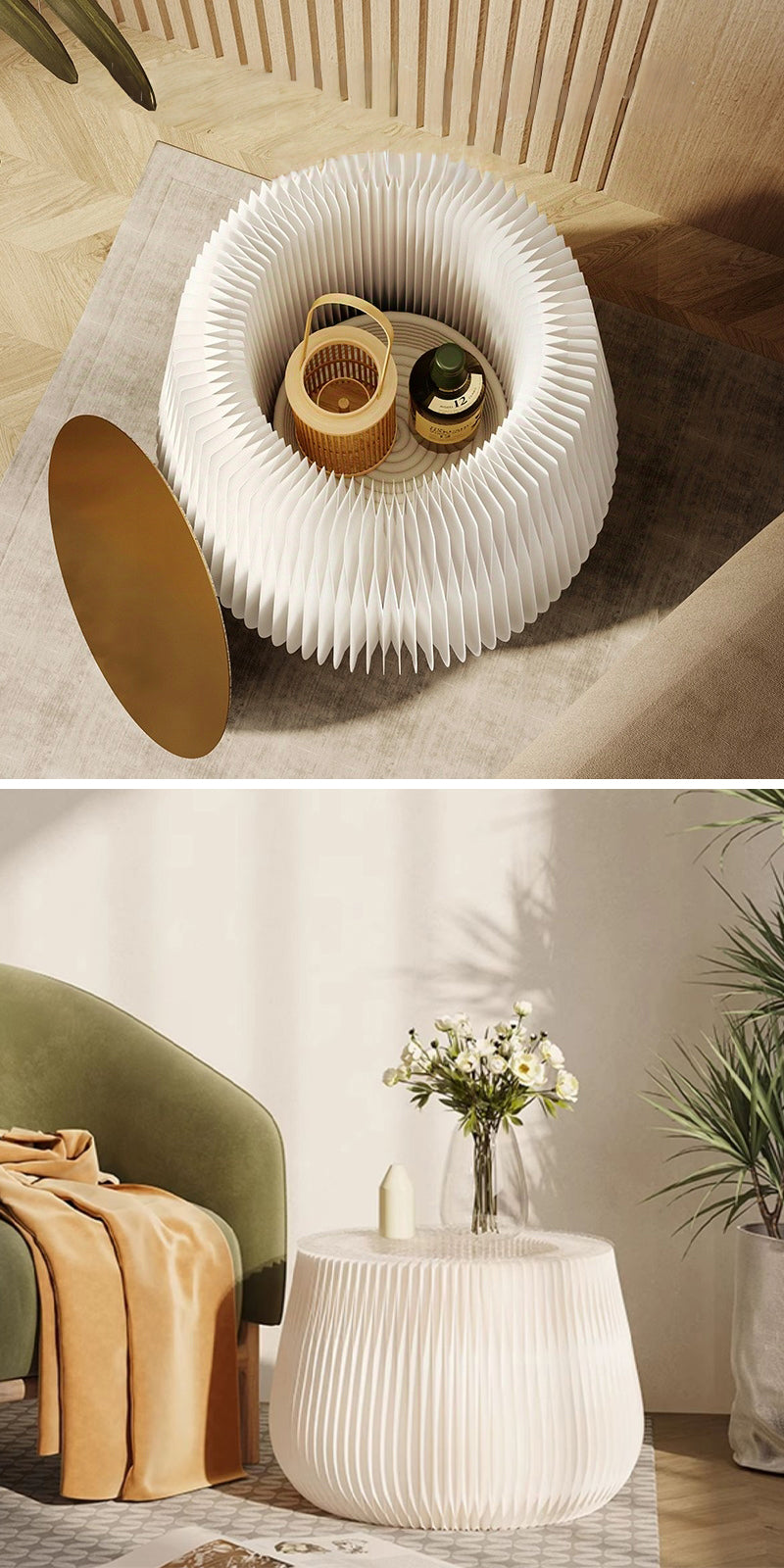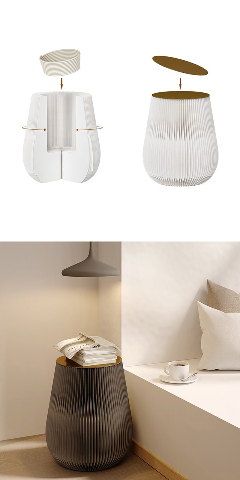 蜂の巣構造を応用したクラフト紙の本体は、軽やかさと安定感を兼ね備え、