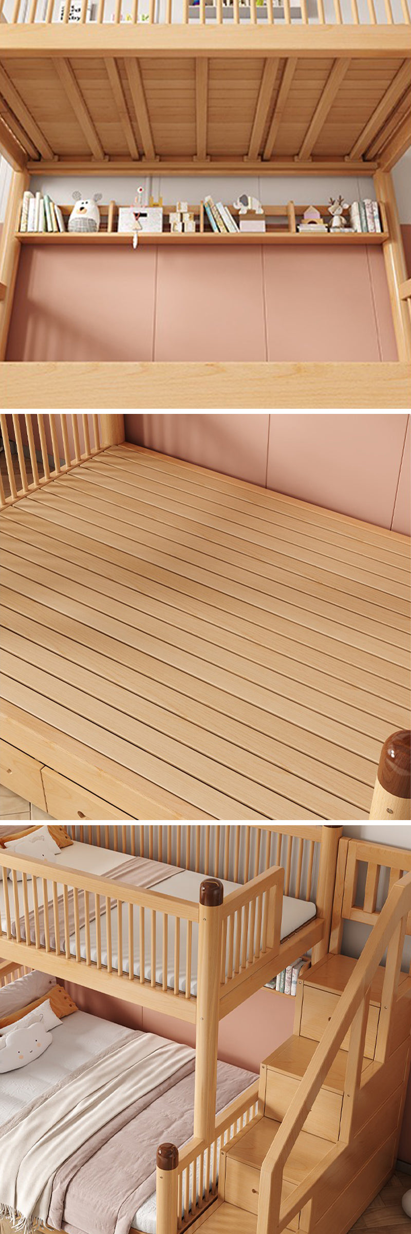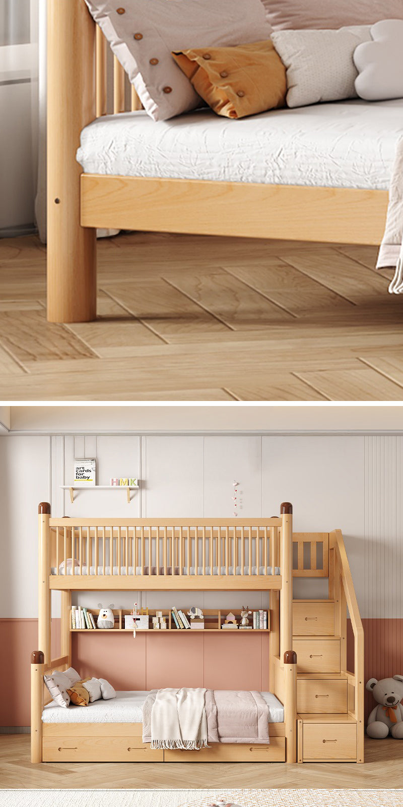 しっかりした構造で、長く安心してお使いいただけます。角のないなめらかな仕上げと、安全に昇り降りできるステップや手すり付きの上段で、お子様にも安心。