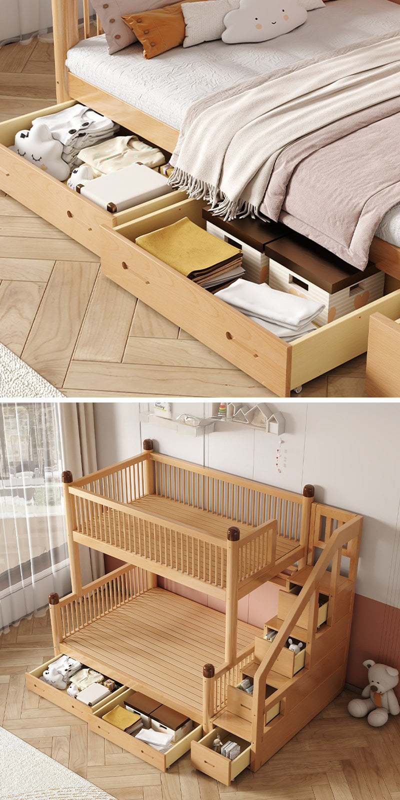 ベッド下には引き出し収納が付属しており、衣類やおもちゃ、寝具などをすっきりと収められます。