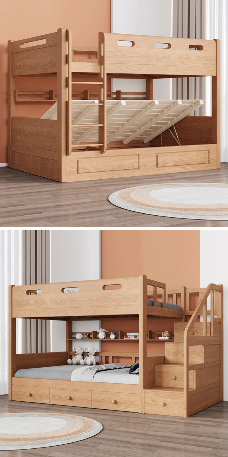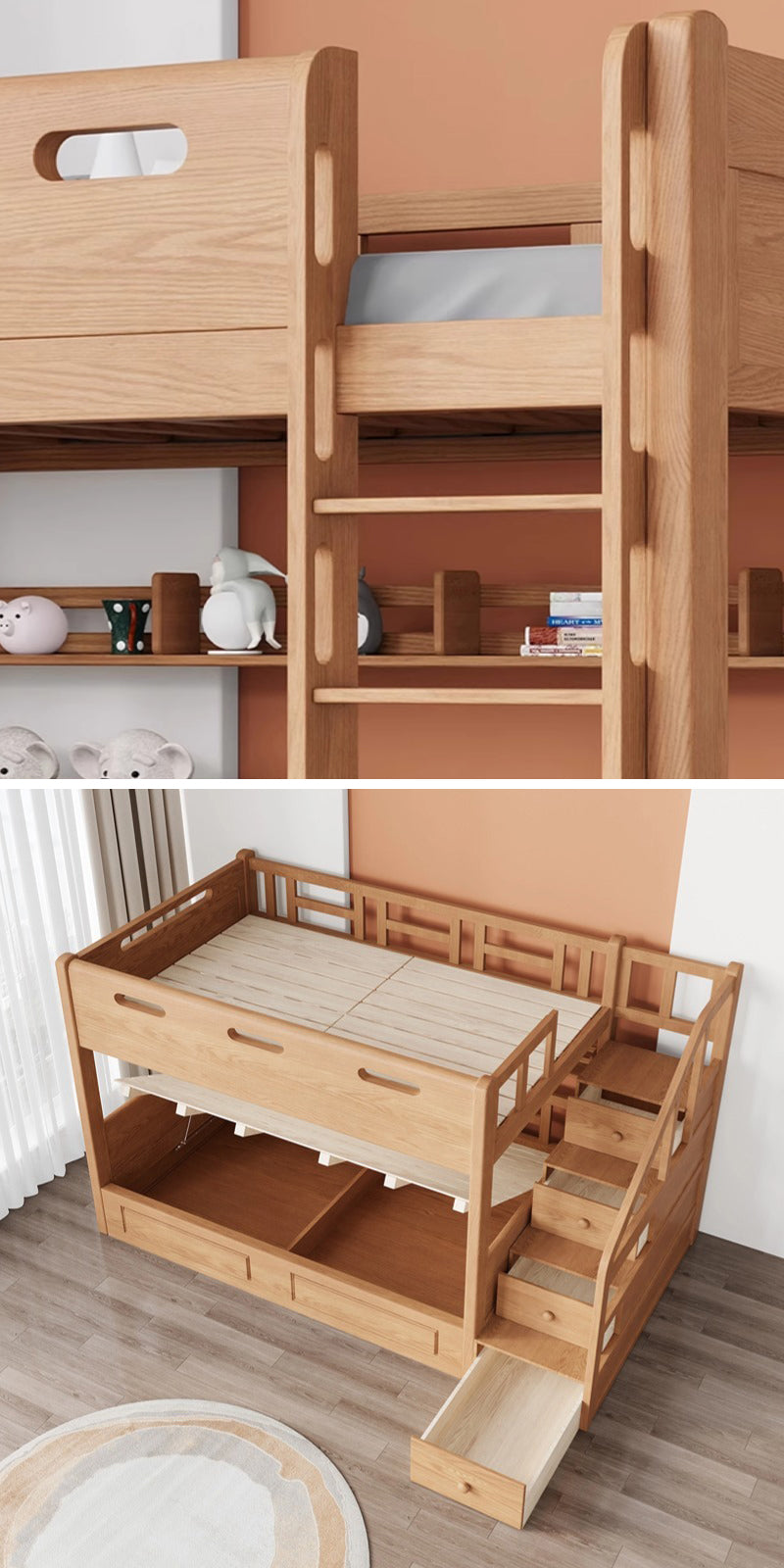 上り階段と階段タンスが一体になったデザインは、収納力も抜群で、子供の成長に合わせて物を整理整頓することができます。