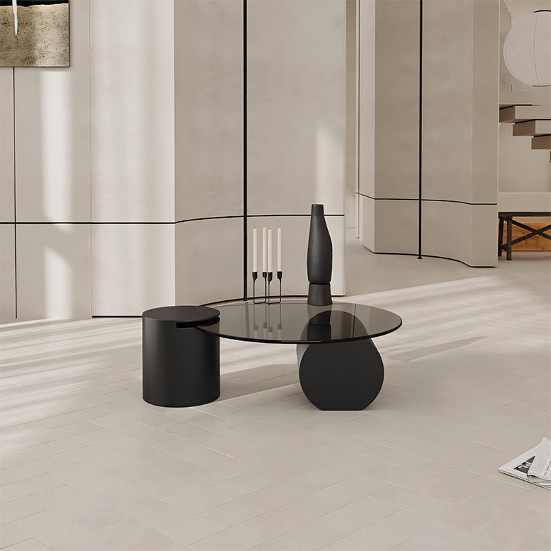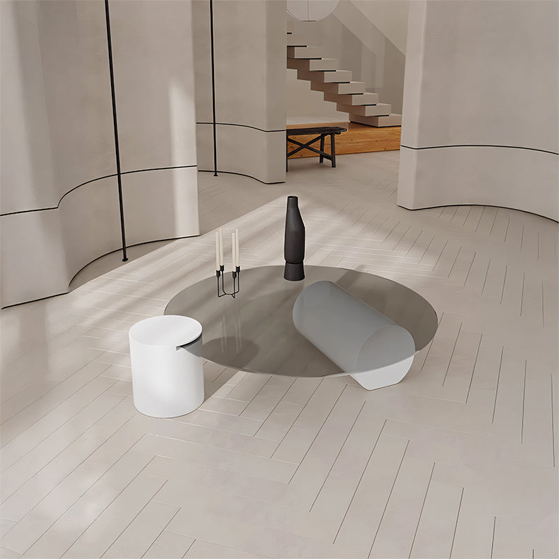 強化ガラス天板とメタルシリンダー脚が描く、彫刻のようなローテーブル。
