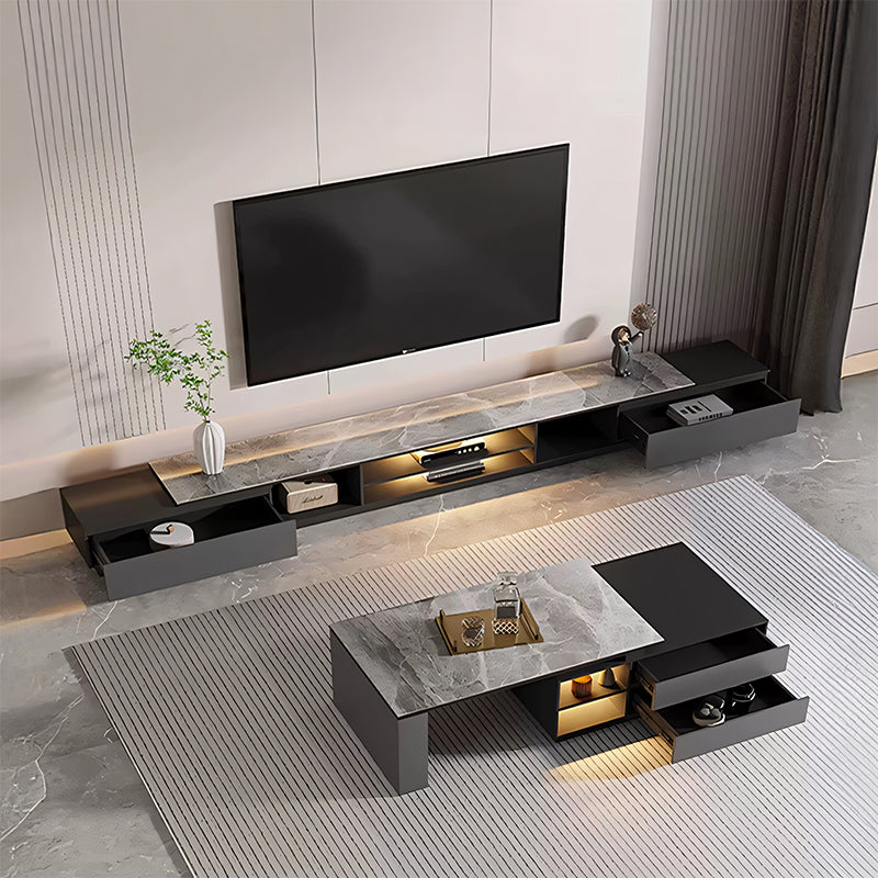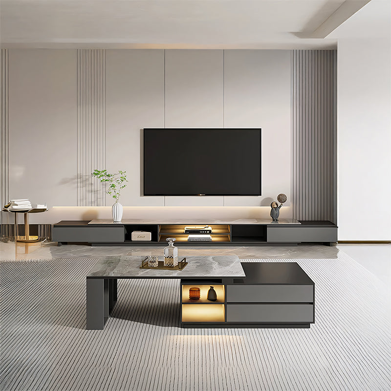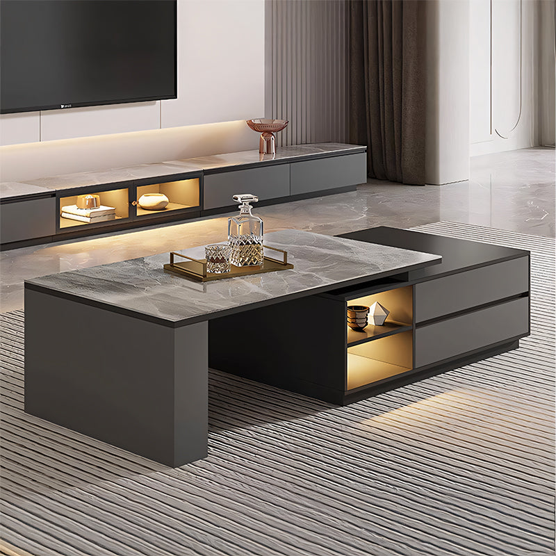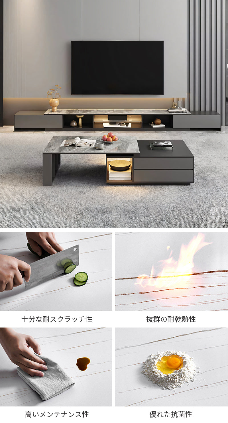 モダンな直線美と重厚感のある天板が調和し、空間に落ち着いた洗練をもたらすローテーブル。石調の質感とガラス面の透明感が、リビングに上質なアクセントを添えます。