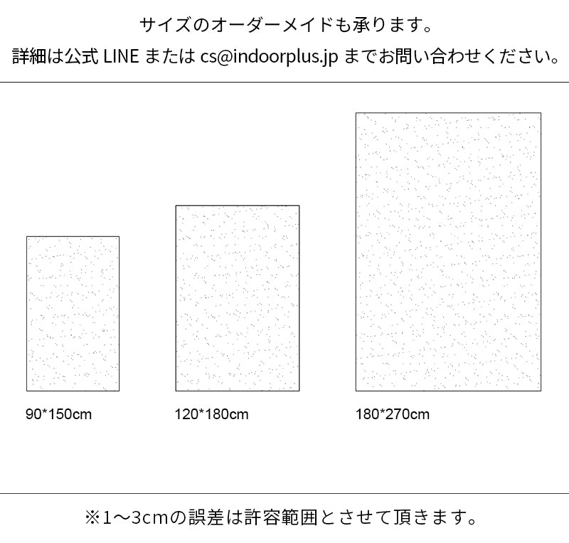 カーペットは織物構造の製品の為、若干サイズのずれが発生しますが、使用に影響が出ない程度に収まります。特に手織りのカーペットにつき、模様を美しくする為に、職人さんより微調整することもありますので、予めご了承ください。