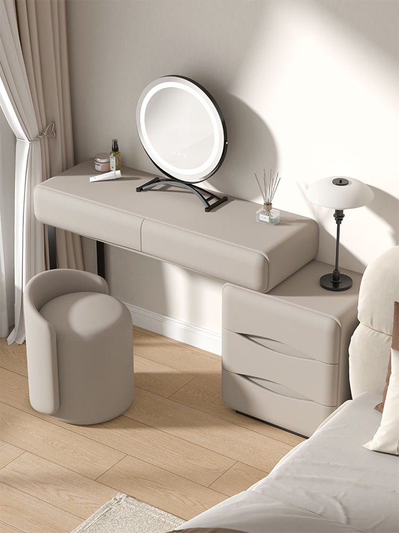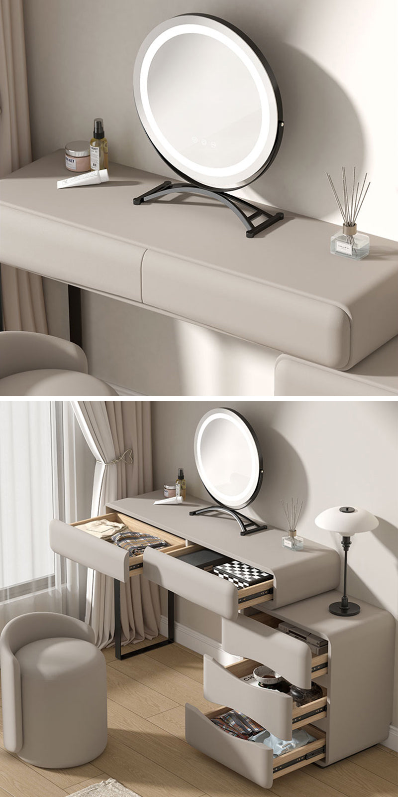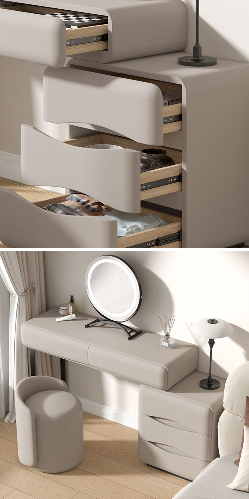 5つの引き出しとスツールが付属し、収納ボックスは自由に調整できるので、お客様の好みに合わせて左右に移動できます。