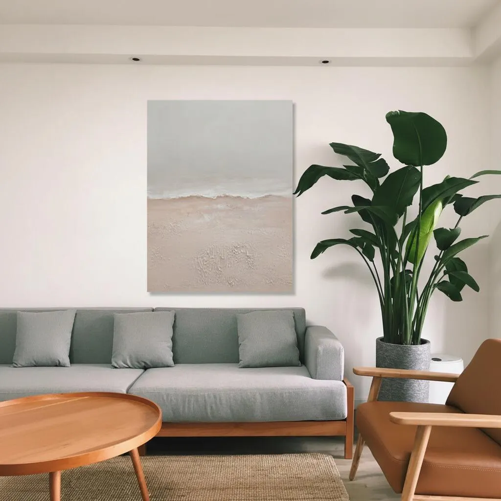 柔らかな色調と繊細な描写は、内装全体に優雅な雰囲気をもたらし、空間にリラックス感や美しさを追加します。海辺の風景を描いているため、ビーチや海をテーマにしたインテリアと相性が良く、白やクリーム色の家具やアクセサリーと組み合わせることで、リゾート感溢れる空間を演出できます。