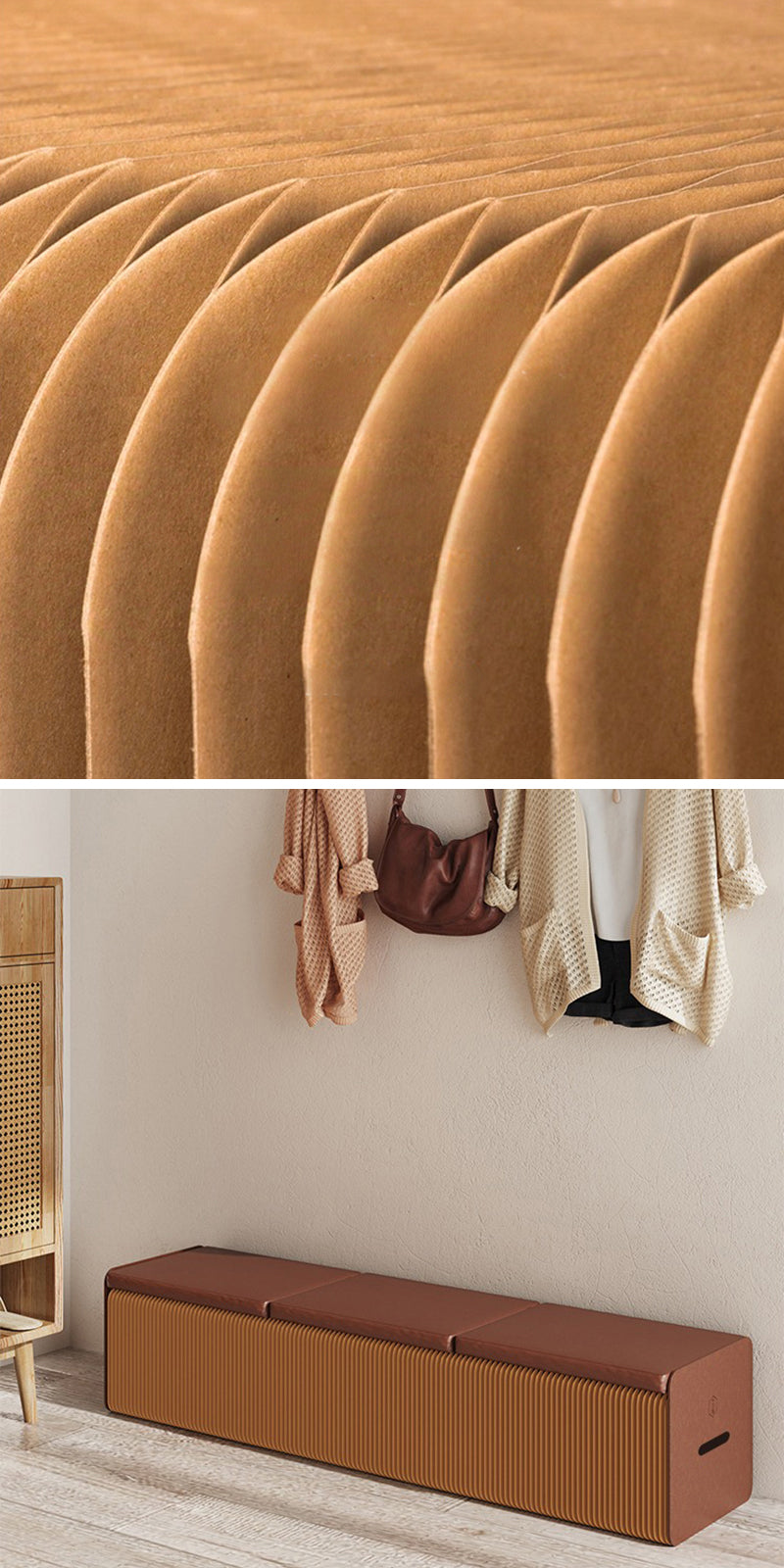 ベンチの本体には六角構造の高密度クラフト紙を採用し、PUクッションが標準装備され、安定感のある座り心地と耐荷重性を実現。