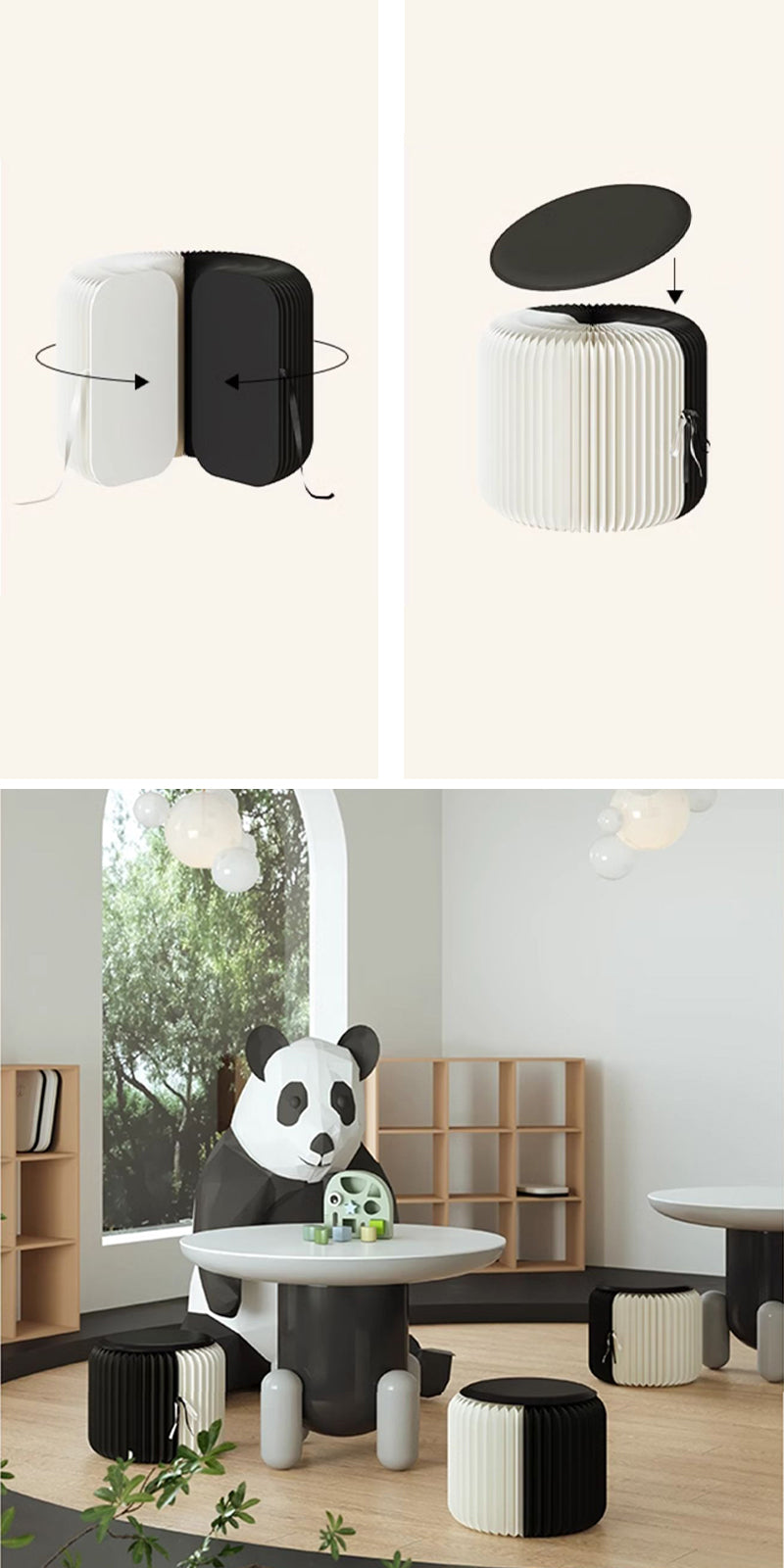 このクラフト紙製のチェアは、かわいらしいデザインで、白黒のユニークな色を組み合わせた「しゃれパンダのベンチ」として、オシャレな生活空間を演出します。