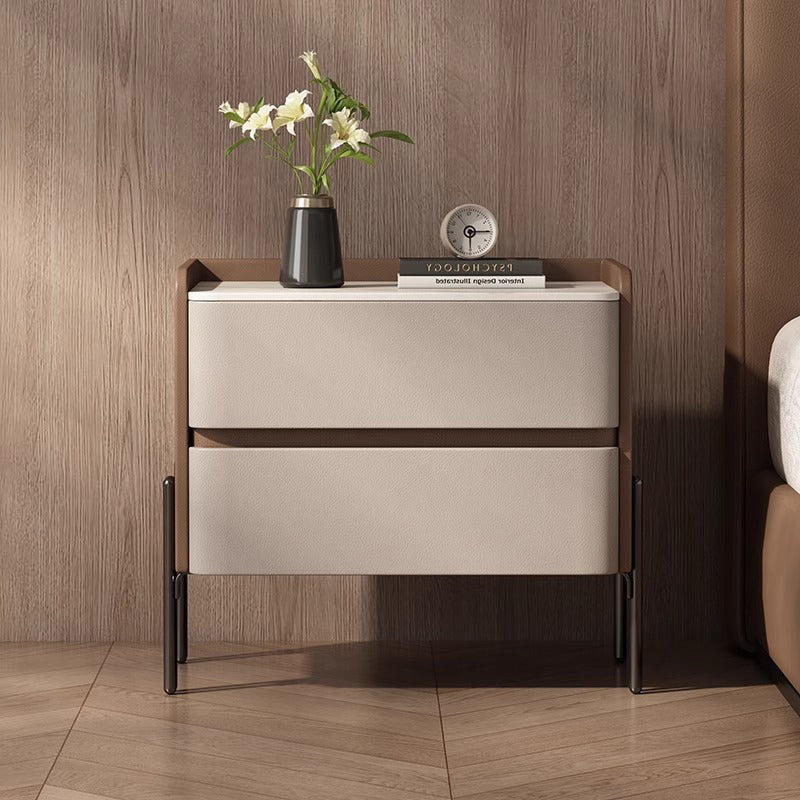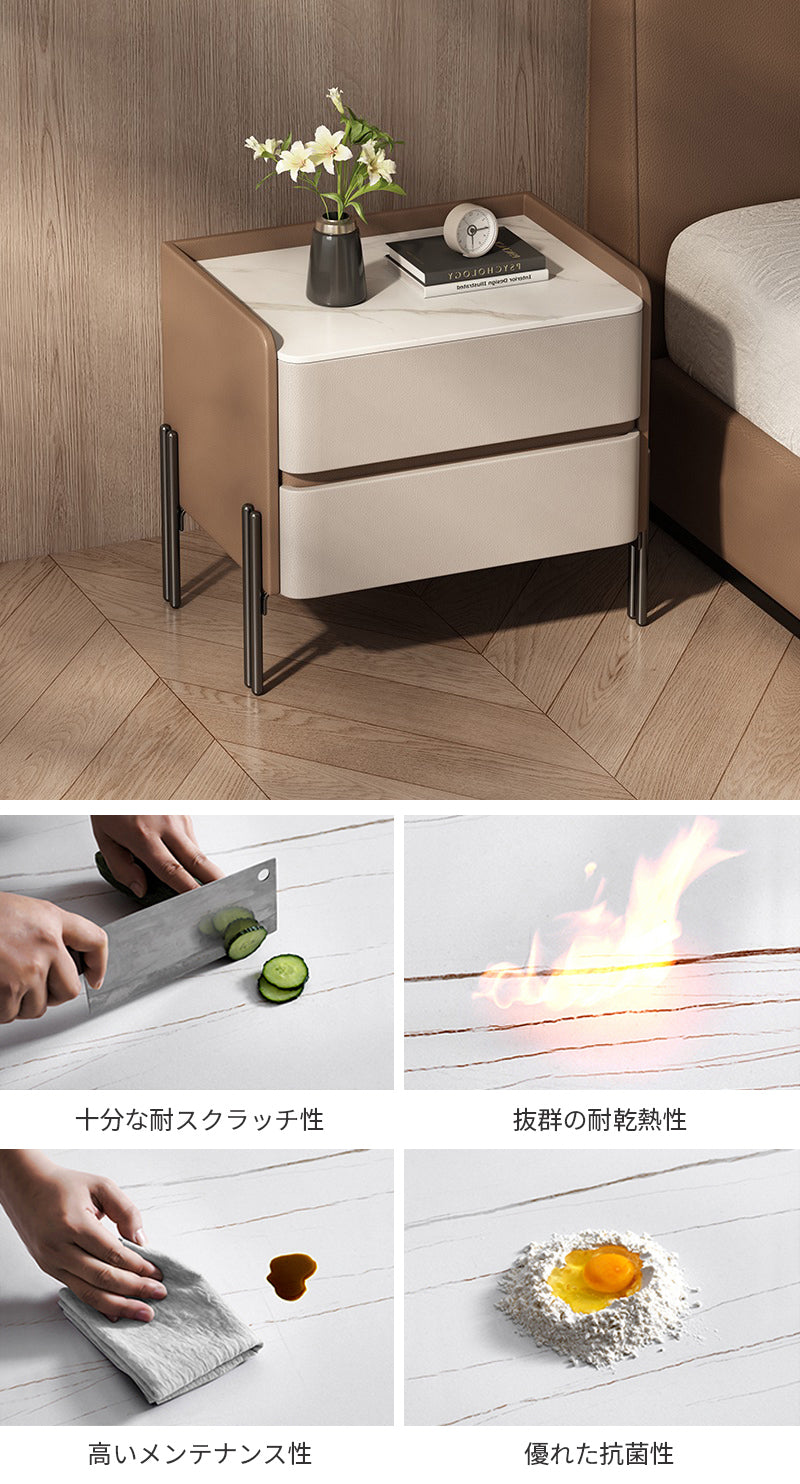 天板には高級シントレードストーン(セラミックの一種)を採用し、傷や汚れに強い仕上げ。正面にはPUレザー、構造体には集成材、脚部にはメタルを組み合わせ、上質さと耐久性を両立しています。