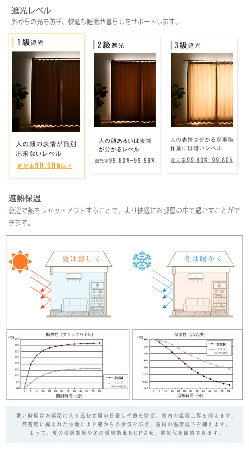 ・機能:遮光、遮熱、防音、防虫・防ダスト効果。 形態安定加工、洗濯機又は手で丸洗い可能 ・遮光レベル:遮光1級 |
