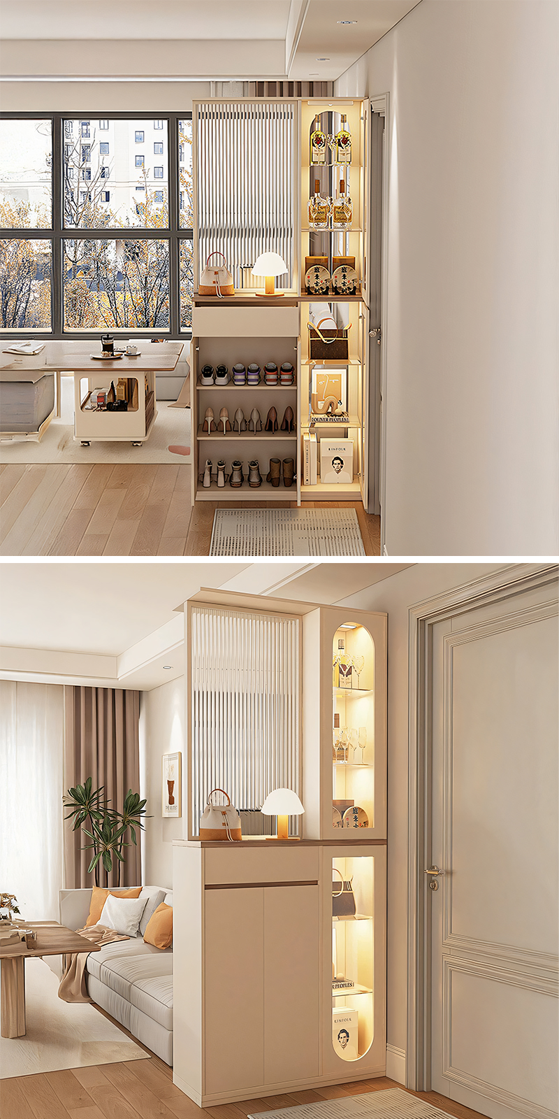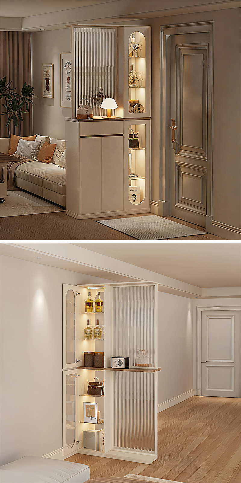 精巧にデザインされた可動式ガラス扉と、細部にまでこだわった棚が、機能性と美しさを兼ね備えています。