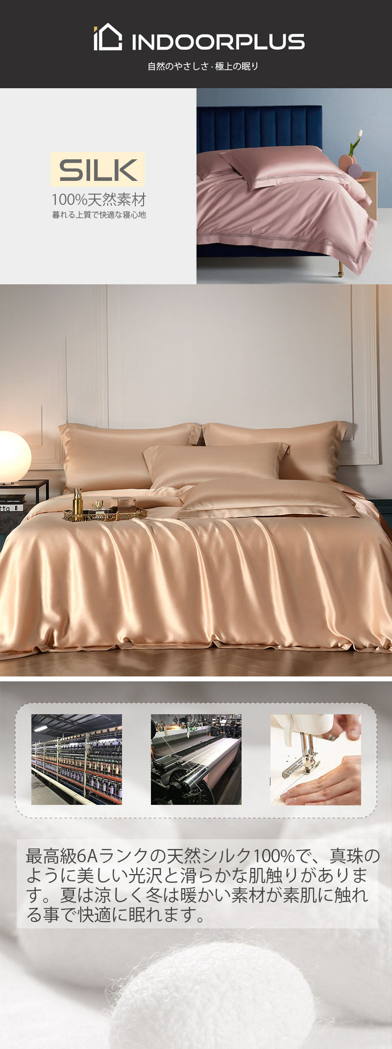 シルクは滑らかな肌触りを実現できる為、他の素材より滑り落ちやすいのが事実ですが、弊社のシルク製品の縁がずれ防止のデザインで丁寧に縫製され、ベッドから滑り落ちません。カバー内側にずれ防止の紐がついている為、布団が泳いでいる心配する必要がございません。