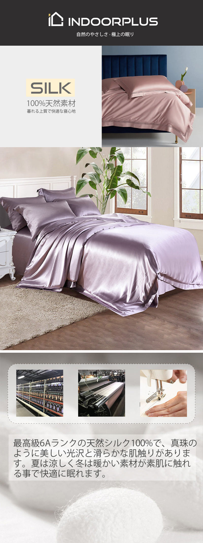シルクは滑らかな肌触りを実現できる為、他の素材より滑り落ちやすいのが事実ですが、弊社のシルク製品の縁がずれ防止のデザインで丁寧に縫製され、ベッドから滑り落ちません。カバー内側にずれ防止の紐がついている為、布団が泳いでいる心配する必要がございません。