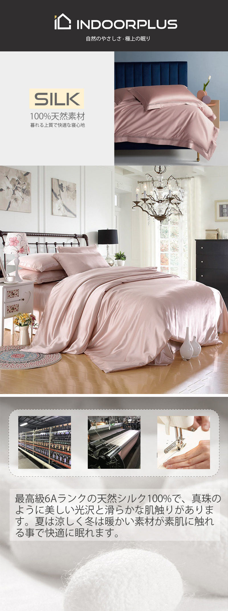 シルクは滑らかな肌触りを実現できる為、他の素材より滑り落ちやすいのが事実ですが、弊社のシルク製品の縁がずれ防止のデザインで丁寧に縫製され、ベッドから滑り落ちません。カバー内側にずれ防止の紐がついている為、布団が泳いでいる心配する必要がございません。
