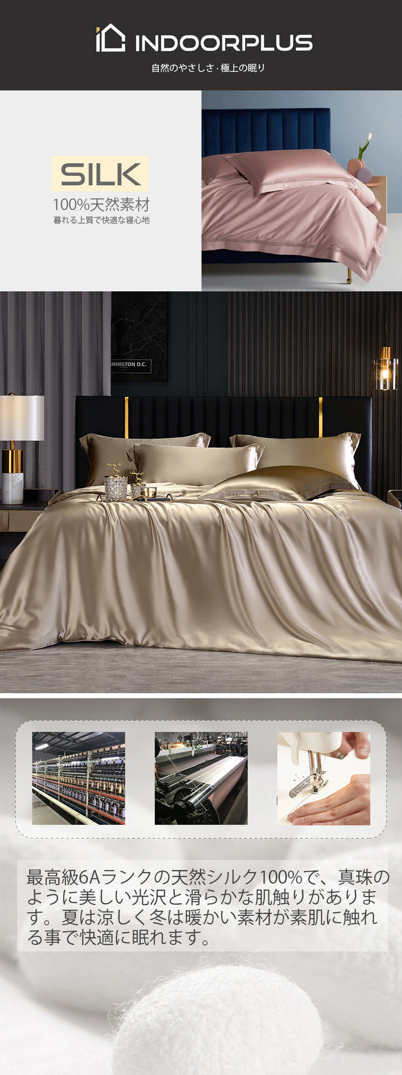 シルクは滑らかな肌触りを実現できる為、他の素材より滑り落ちやすいのが事実ですが、弊社のシルク製品の縁がずれ防止のデザインで丁寧に縫製され、ベッドから滑り落ちません。カバー内側にずれ防止の紐がついている為、布団が泳いでいる心配する必要がございません。