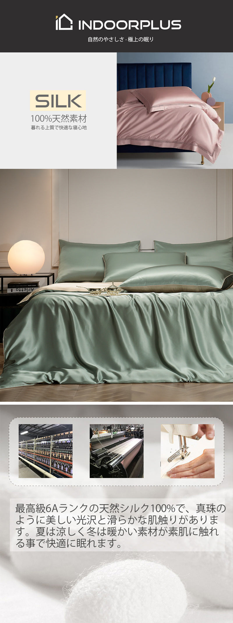 シルクは滑らかな肌触りを実現できる為、他の素材より滑り落ちやすいのが事実ですが、弊社のシルク製品の縁がずれ防止のデザインで丁寧に縫製され、ベッドから滑り落ちません。カバー内側にずれ防止の紐がついている為、布団が泳いでいる心配する必要がございません。